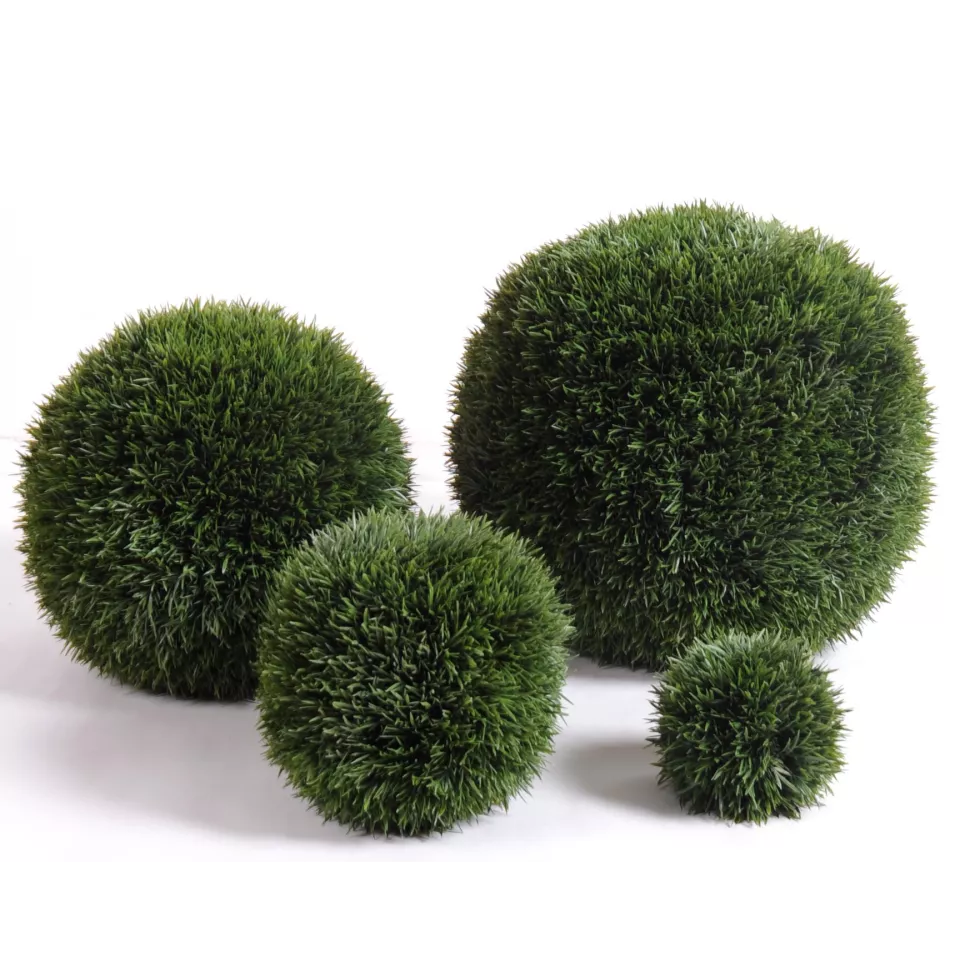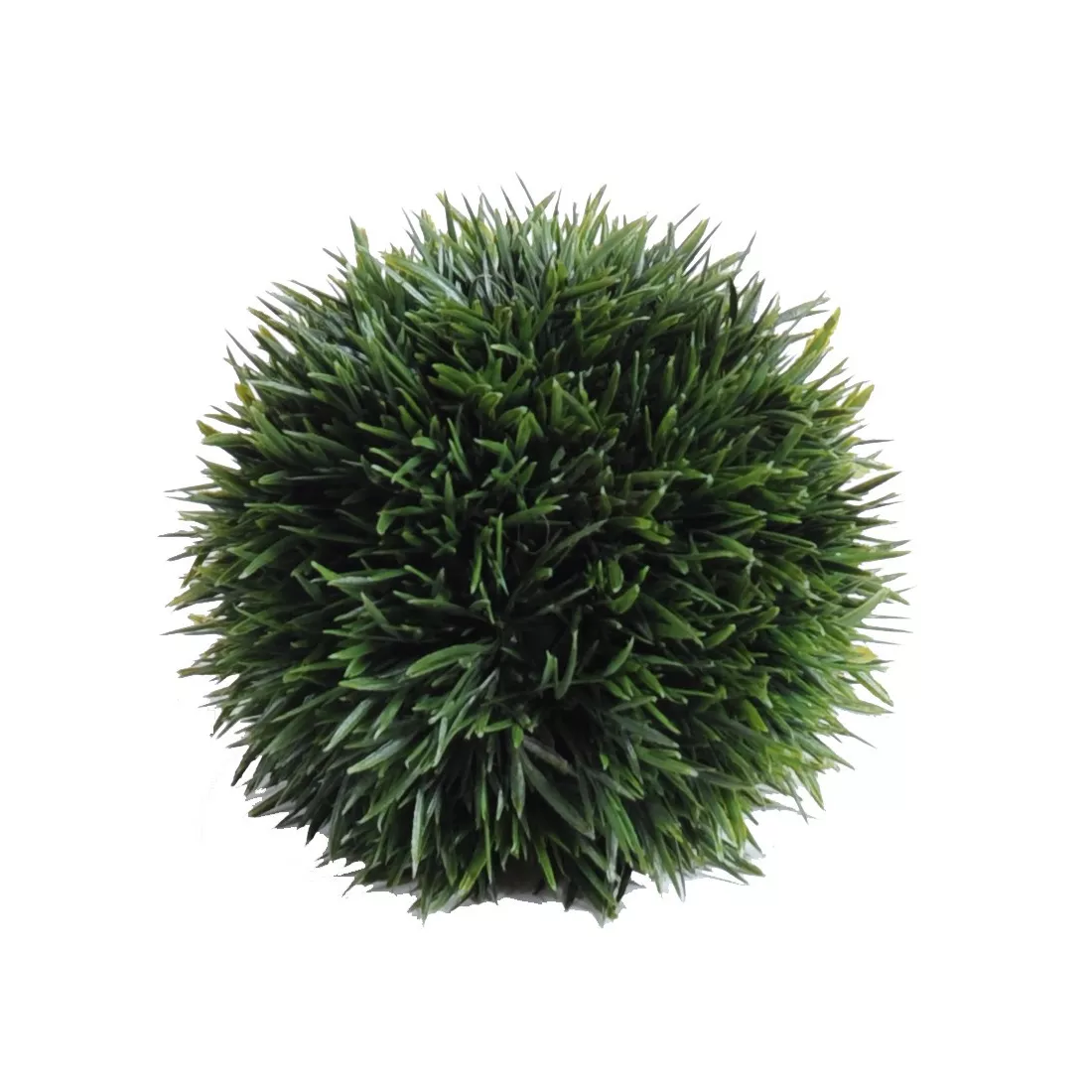 boule d'herbe artificielle ronde de 13 cm de diamètre, composé d'un feuillage en polyéthylène et de deux demi sphères clipsées en plastique, vendue sans pot plante artificielle