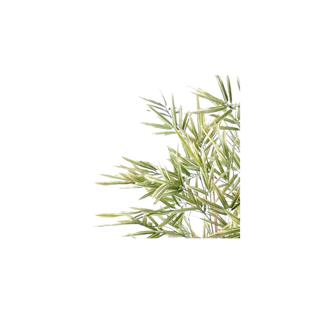 Par son feuillage panachées de vert et blanc crème, ce bambou amènera une note originale et ambiance zen à votre intérieur. Avec son feuillage dense, permet de constituer des haies artificielles. Il est une belle imitation du "Hibanobambusa Tranquillans Shiroshima", il est un magnifique bambou au feuillage zébré de vert et de blanc crème. Ses chaumes sont de couleurs naturelles et son port est buissonnant.