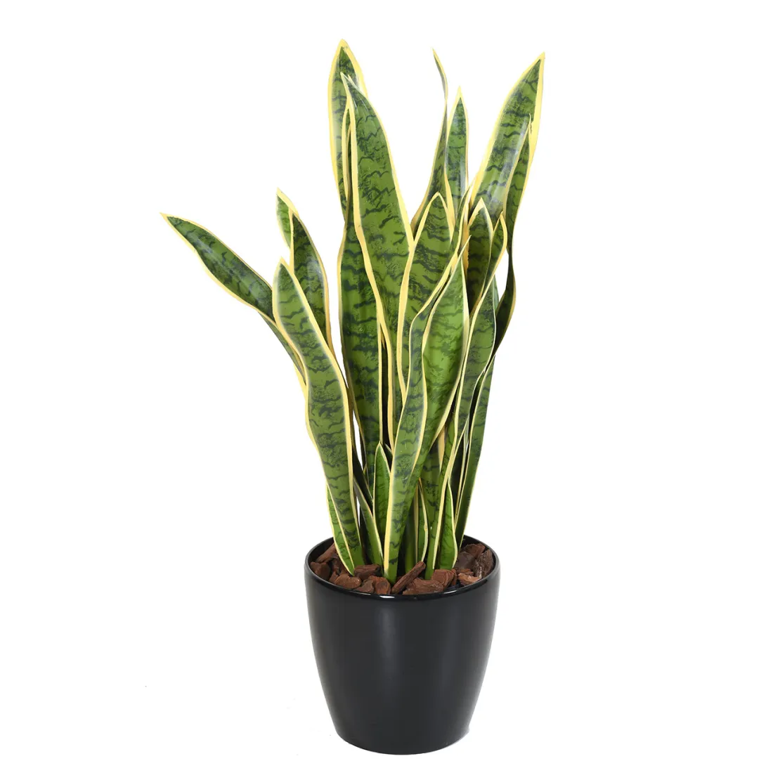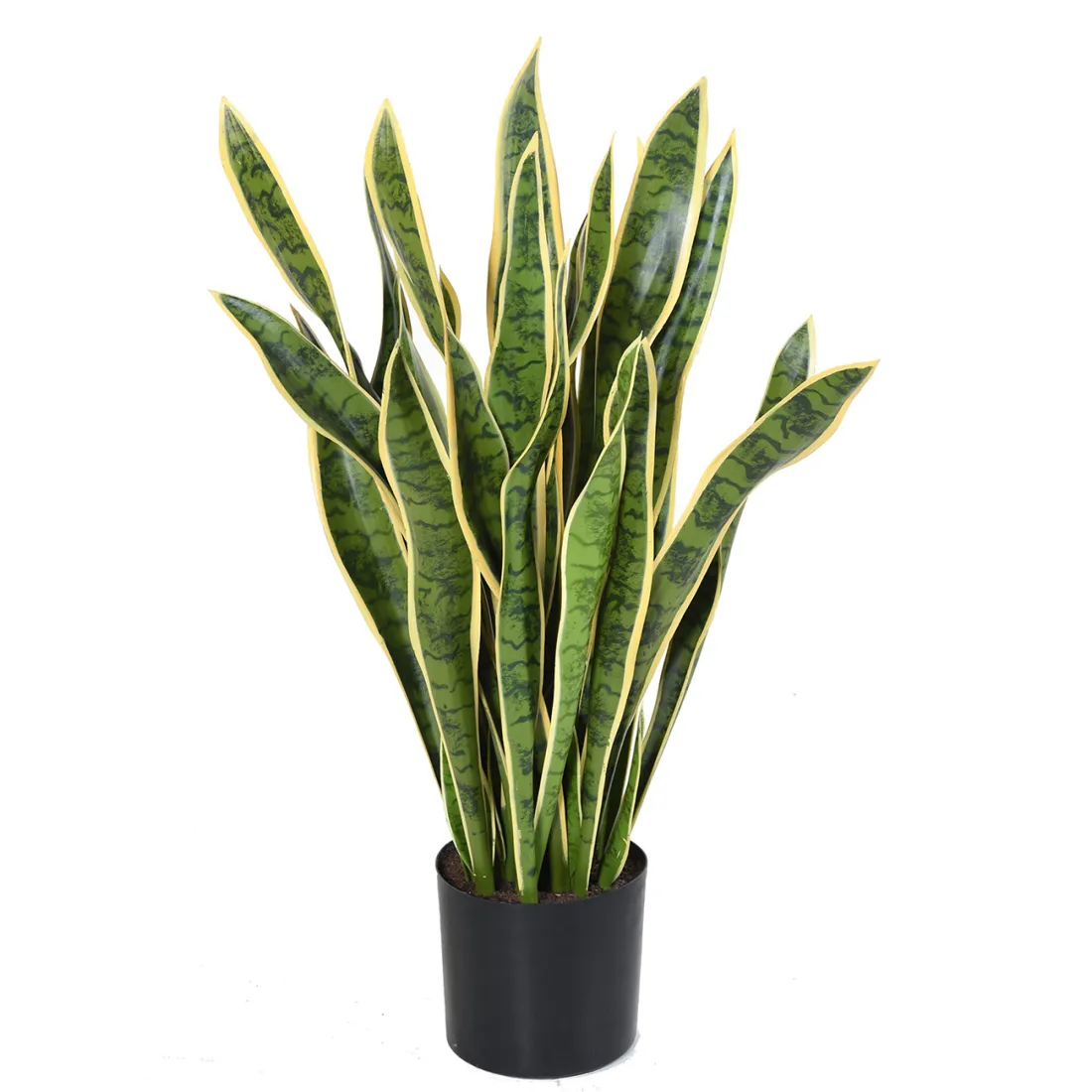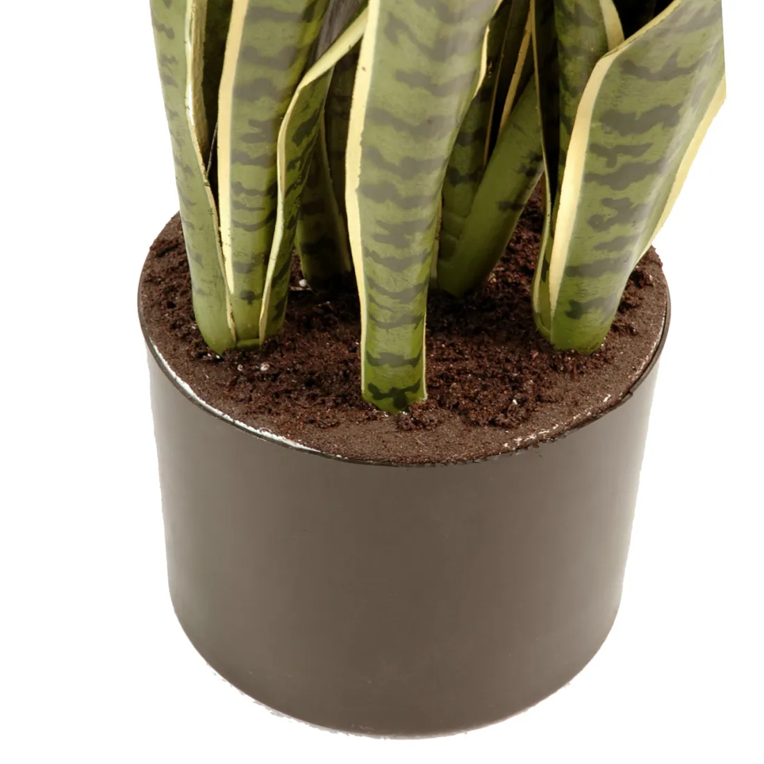 Le sansevieria originaire des régions subtropicales, familièrement appelée Langue de belle mère ou plante serpent. Ce sanseveria artificielle est une copie parfaite du sansevieria trifacciata. Elle est composée de 33 feuilles en polyéthylène, matière plastique. La taille est de 93 cm pour 55 cm d'envergure. Ses feuilles rigides verticales sont soit vertes avec des bandes transversales de couleur vert foncé, ou vertes avec une bordure jaune.Cette Sansieria artificielle superbe réalisation. Livré dans un pot pvc lesté servant de support de calage. la taille indiquée est comprise de la base du pot jusqu'au sommet de la plante.