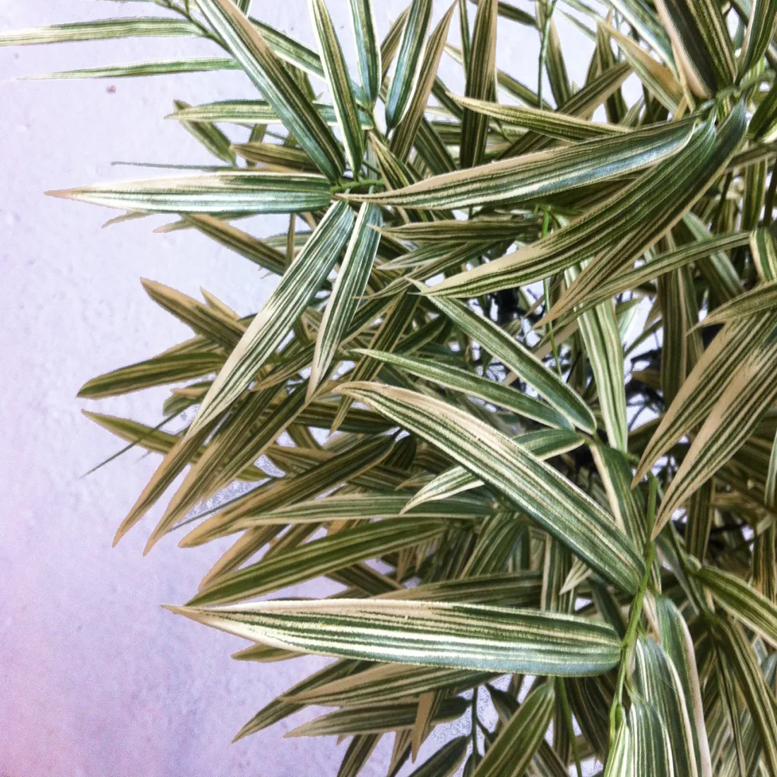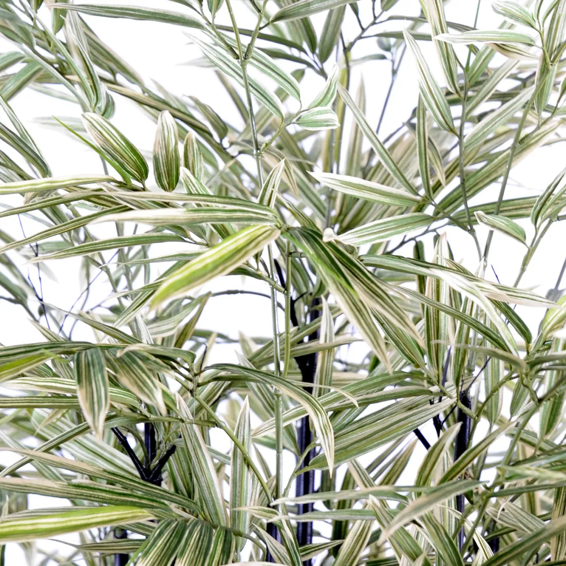 Cannes naturelles reteintées, feuillage panaché plutôt en isolé, ce bambou est original, élégant, il s'accorde très bien dans les intérieurs modernes et contemporains.Très joli bambou aux longues cannes fines qui mettent en valeur son superbe feuillage artificiel panaché de rayures crèmes et vertes