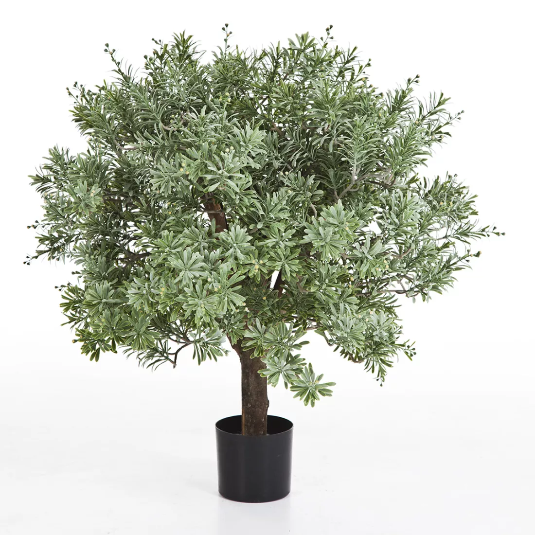 Schefflera artificiel buisson livré dans un pot lesté il mesure 90 cm de hauteur pour une envergure de 80 cm. Ses troncs sont en bois naturel et son feuillage tissu polyester.