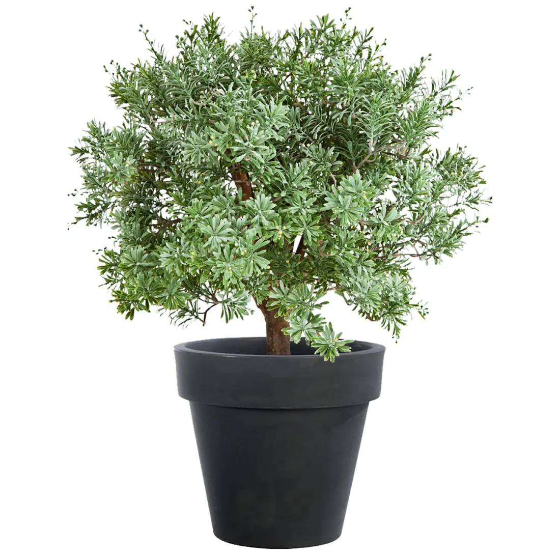 composé d'un tronc en bois naturel et d'un feuillage vert en plastique. Boule de 60 cm de diamètre, livré dans un support plastique (pot PVC)