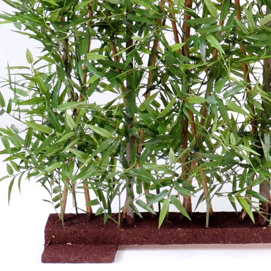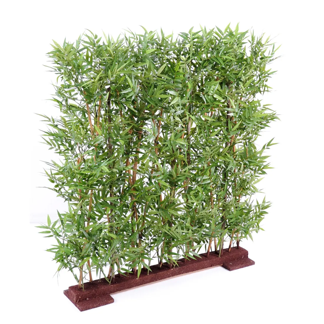 Haie de bambou artificiel oriental dense est composé de cannes de bambou naturel et d'un feuillage vert en tissu. Décliné en 2 tailles 110 et 150 cm de hauteur pour 90 cm de longueur et 30 cm de largeur. Livré sur socle de 90 cm de longueur par 18 cm de largeur( plantes artificielles ) feuillage dense. Livré en un seul morceau, cannes fixées sur socle ( plantes artificielles ) Opacité : 80%
