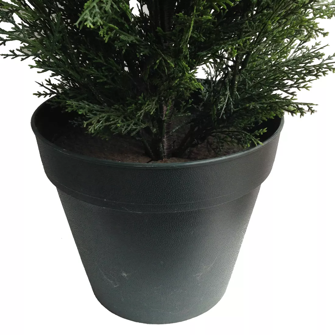 Ce cyprès artificiel junipérus est composé d'un feuillage vert en Polyéthylène (plastique) et d'un tronc en bois naturel. Sa hauteur est de 65 cm pour une envergure de 32 cm.