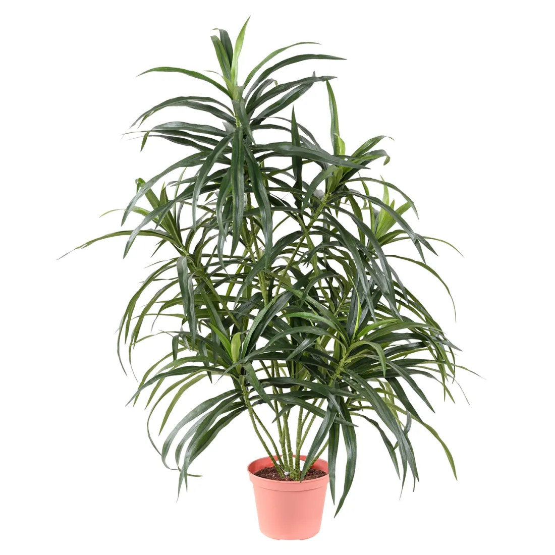 Le Dracéna aussi appelé dragonnier, ou Dracaena qui signifie littéralement dragon femelle, est une plante originaire d’Afrique tropicale et d’Asie appartenant à la famille des Agavacées. Cette belle plante d’intérieur dispose d’un feuillage artificiel décoratif fait de feuilles synthétiques de différentes teintes de vert. Les tiges-troncs de cet arbuste factice sont en métal et recouvertes de plastique vert ce qui vous permettra de déployer votre plante plus facilement. D’ordinaire difficile à entretenir, celui-ci ne nécessite ni taille, ni arrosage, simplement un petit dépoussiérage occasionnellement et le tour est joué !