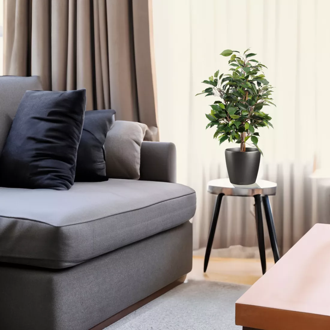L' Arbre artificiel Ficus Natasja est une plante synthétique plutôt prévue pour l'intérieur, d'une hauteur de 60 cm. Son tronc en bois en fait un faux petit arbuste très proche du vrai. C'est une plante typique de nos intérieurs.