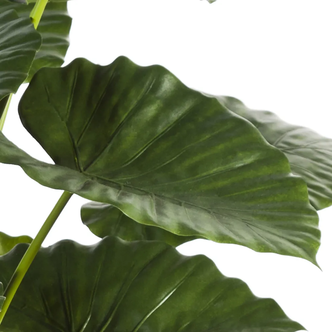 Cette plante verte artificielle est particulièrement remarquable par ses feuilles géantes, qui vont créer une ambiance exubérante et tropicale dans votre salon ! Elle est aussi appelée Oreilles d'éléphant grâce à ses grandes feuilles en forme de coeur.  Son feuillage artificiel est vert moyen contrasté par des nervures saillantes vert clair. Cette plante synthétique est vendue dans un support plastique (pot PVC noir), la taille indiquée est comprise de la base du pot jusqu'au sommet de la plante.