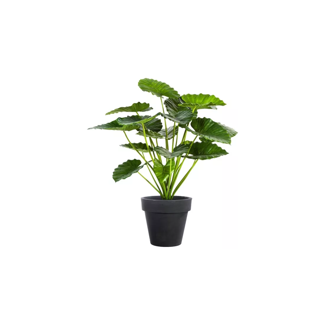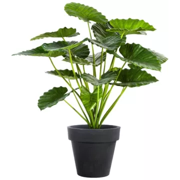 Cette plante verte artificielle est particulièrement remarquable par ses feuilles géantes, qui vont créer une ambiance exubérante et tropicale dans votre salon ! Elle est aussi appelée Oreilles d'éléphant grâce à ses grandes feuilles en forme de coeur.  Son feuillage artificiel est vert moyen contrasté par des nervures saillantes vert clair. Cette plante synthétique est vendue dans un support plastique (pot PVC noir), la taille indiquée est comprise de la base du pot jusqu'au sommet de la plante.
