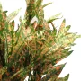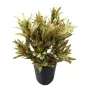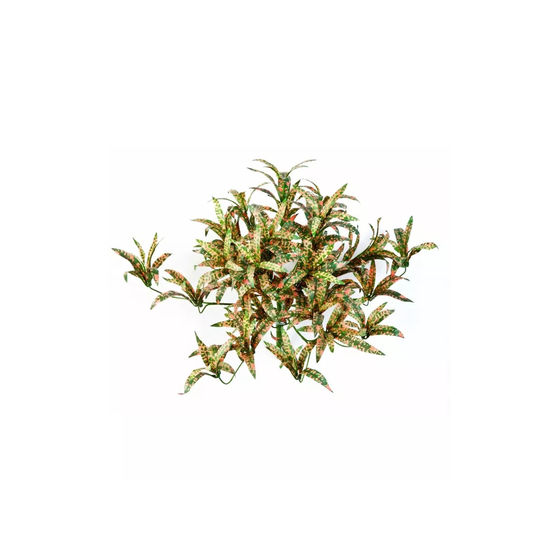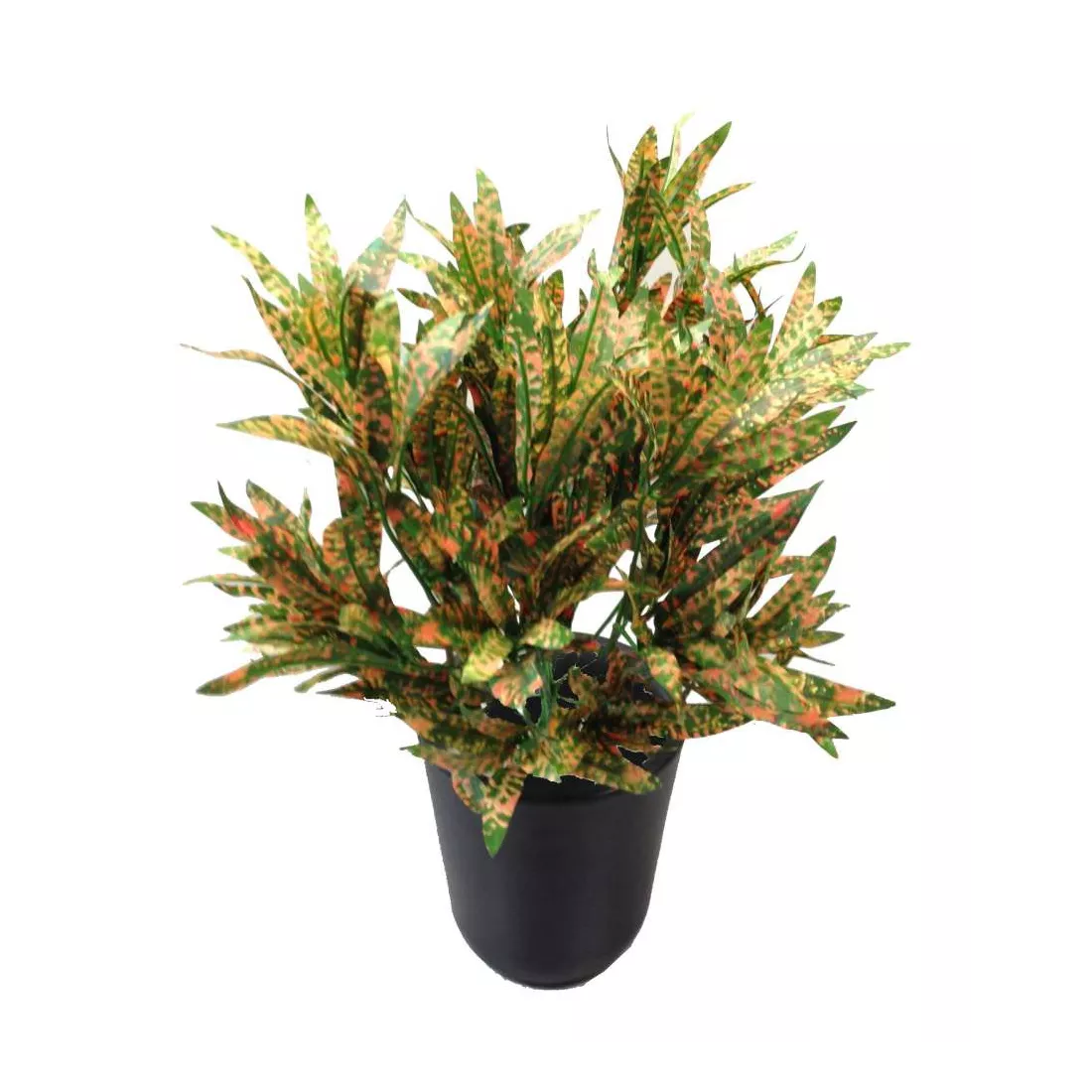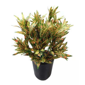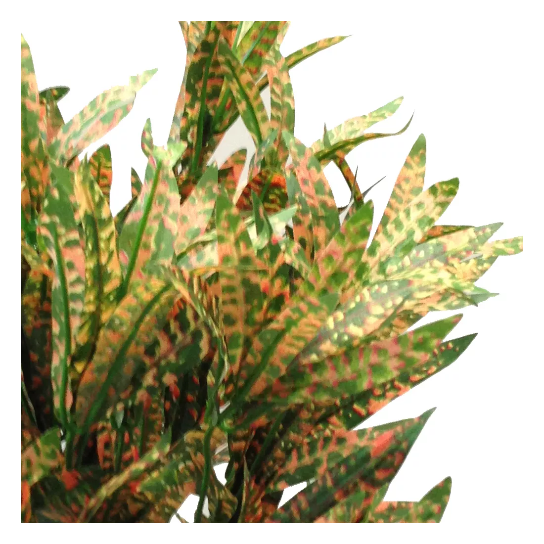 Le Codiaeum variegatum ou croton est un genre d’arbuste tropical appartenant à la famille des Euphorbiacées originaire de Malaisie et des îles du Pacifique. Son magnifique feuillage synthétique aux couleurs flamboyantes constitué de feuilles artificielles tachetées en tissu, colorées de nuances de vert et d’orange feu/jaune. Ses tiges en métal de différentes longueurs vous faciliteront la mise en scène. C’est une fausse plante haut de gamme plus vraie que nature. Idéale quand on n’a pas la main verte, elle ne nécessite aucun entretien particulier.