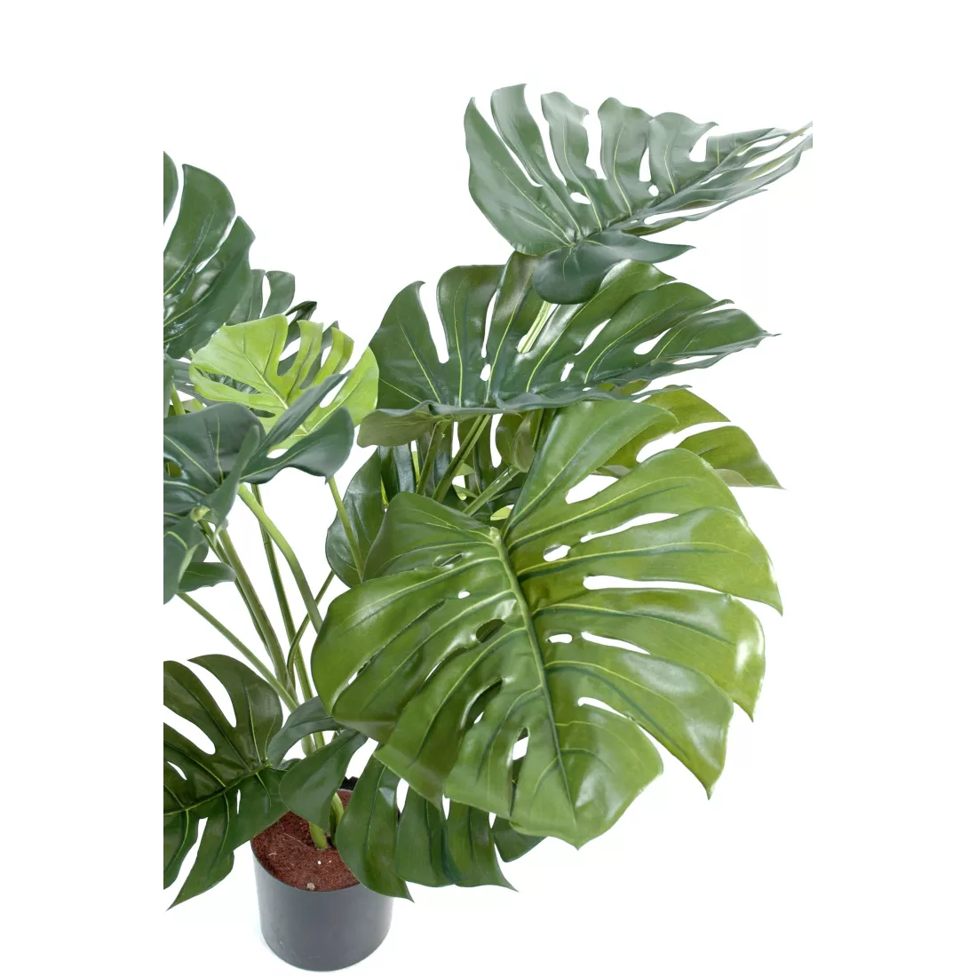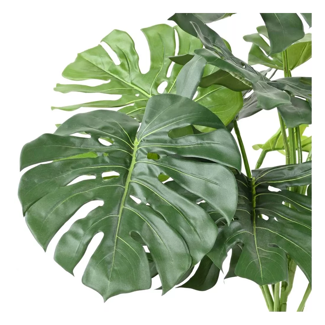 Philodendron géant Monstera artificiel mesurant 85 cm de hauteur pour une envergure variable suivant le déploiement opéré pour son feuillage. Cette plante verte tropicale synthétique est composée de longs pétioles (tiges) armés sur lesquels reposent d’impressionnantes feuilles artificielles découpées et trouées en tergal. La teinte vernissée de ses feuilles varie d’un vert clair à un élégant vert sombre pour une ressemblance accrue au naturel. Livré dans un support en plastique, la taille indiquée est comprise de la base du pot jusqu'au sommet de la plante.