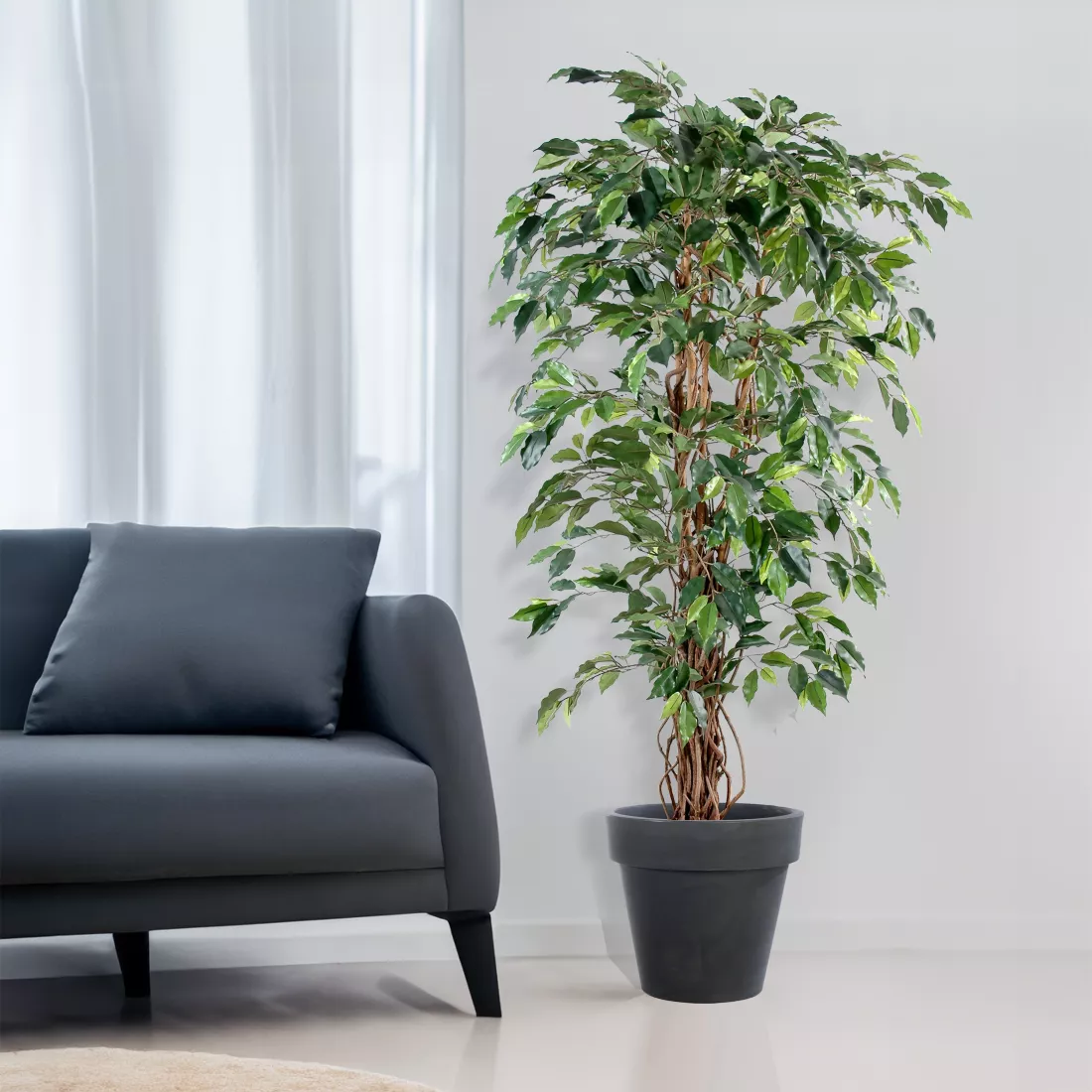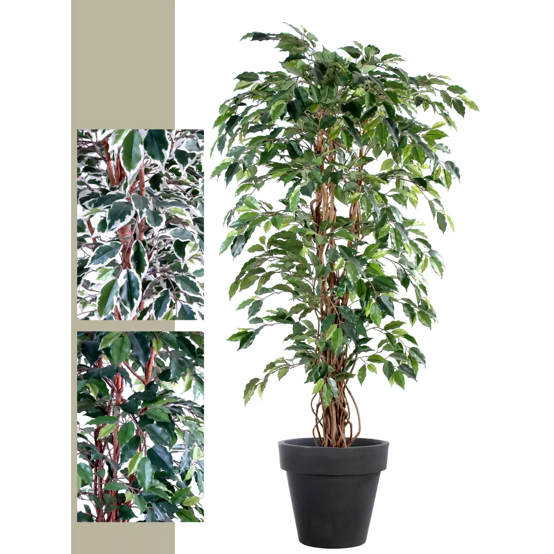 Ce ficus artificiel liane est composé d'un tronc en bois naturel et d'un feuillage vert ou vert/crème en tergal. Un vaste choix de déclinaisons est proposé pour cet arbre artificiel, allant de 150 à 210 cm de hauteur. livré dans un pot basique plastique lesté (support de plantation) plantes artificielles