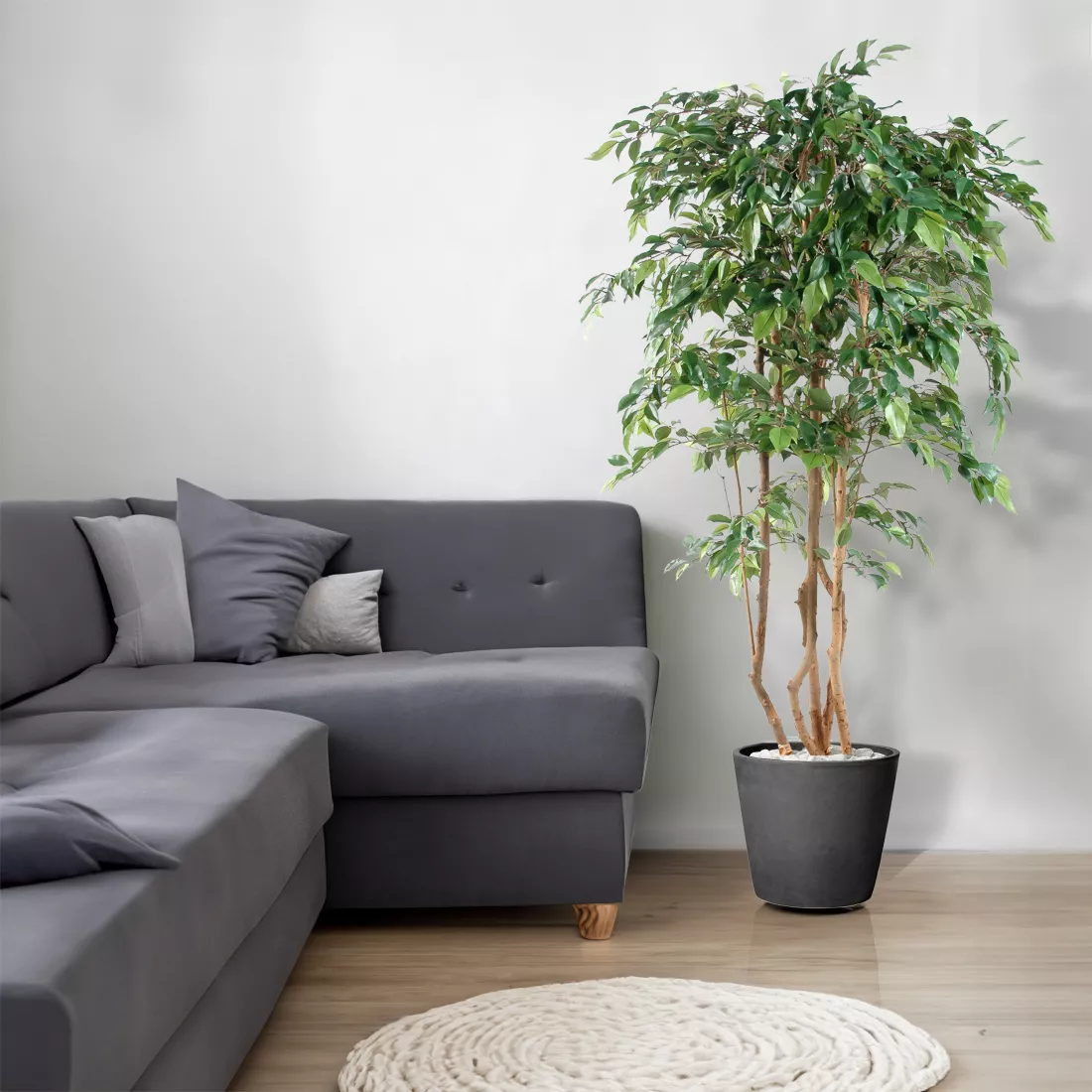 Le Ficus artificiel natasja est composé de tronc en bois et d'un feuillage en tergal vert (3 tons), Vaste déclinaison de 110 à 2410 cm de hauteur, Livré dans un support plastique ( plantes artificielles )