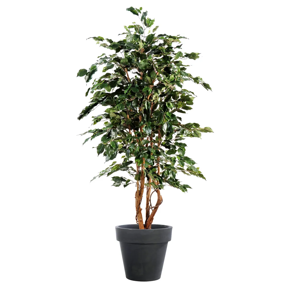 Ficus artificiel est composé de troncs en bois naturel et d'un feuillage en tergal, soit en vert (trois tons de vert) soit panaché (vert/crème), décliné en deux dimensions de 180 et 210 cm de hauteur. Livré dans un pot PVC (support de plantation) plantes artificielles