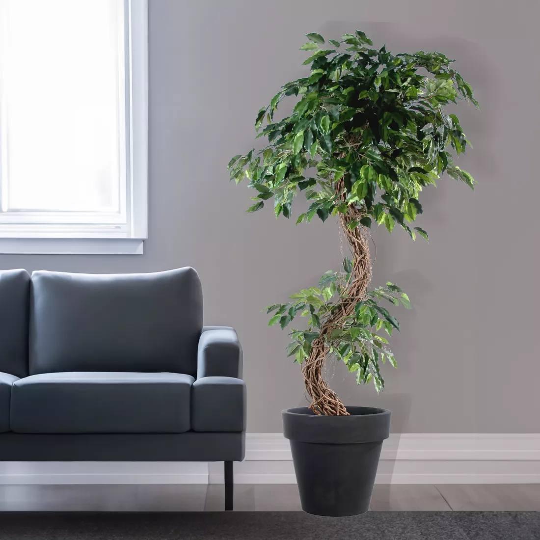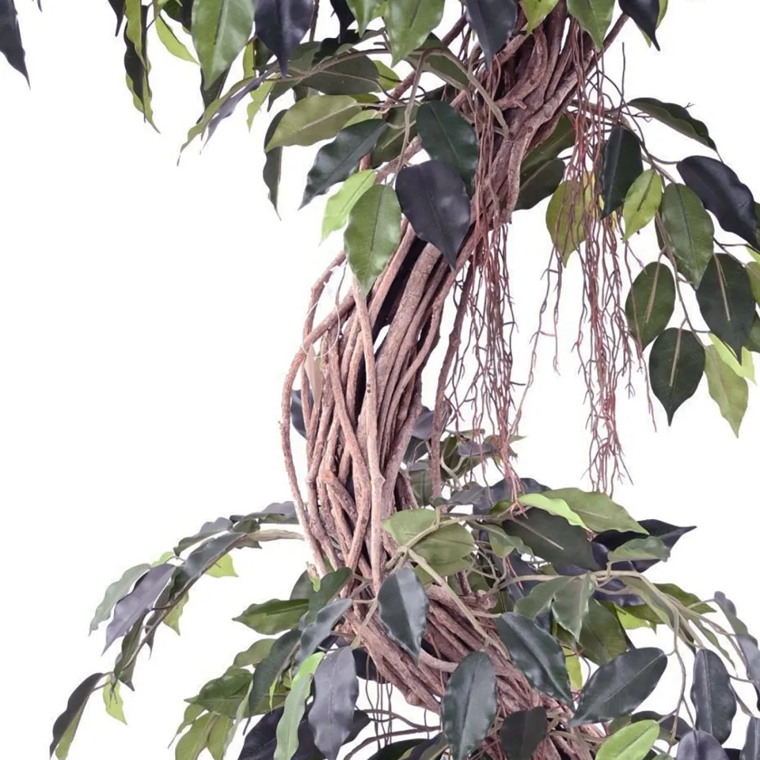 Ficus artificiel S est composé d'un  troncs de lianes entremêlées en bois naturel et d'un feuillage en tergal, , décliné en deux dimensions de 180 et 210 cm de hauteur. livré dans un pot plastique (support de plantation) plantes artificielles