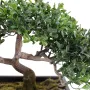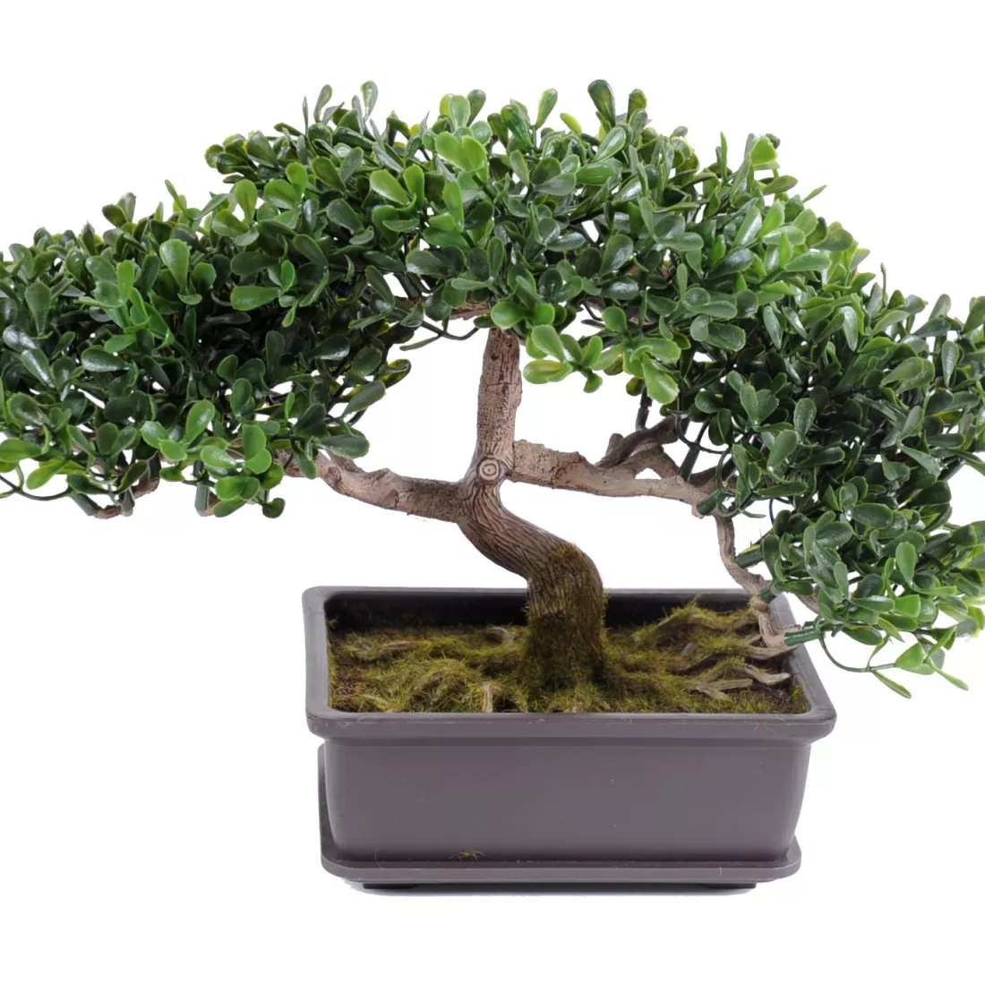 Ce bonsaï ou bonzaï artificiel est une imitation de l'arbre à thé, son tronc reproduit l'aspect du vraie tronc, son feuillage en polyéthylène, matière plastique, est traité contre les uv, il peut être mis en extérieur. En surfaçage, pour un bon réalisme, les racines sont légèrement recouverte de mousse artificielle. Disposé dans une coupe en polypropylène, PVC, coupe traditionnel pour la culture des bonsaï. La taille indiquée est comprise de la base du pot jusqu'au sommet de la plante