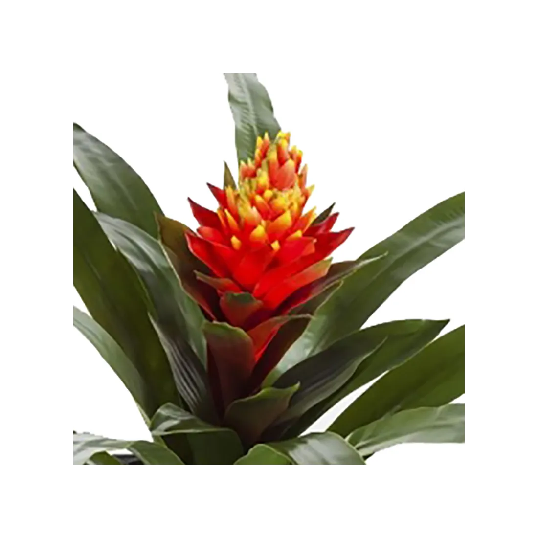 Le Guzmania est une plante tropicale qui appartient à la famille des Broméliacées. La version artificielle est particulièrement décorative et réaliste. Il est possible de la travailler en touffe de plusieurs plantes. Le faux Bromelia s'accorde avec les arbustes artificiels exotiques ou des fausses plantes vertes comme le tillandsia. La plante fleurie peut s'exposer seule dans un joli pot.