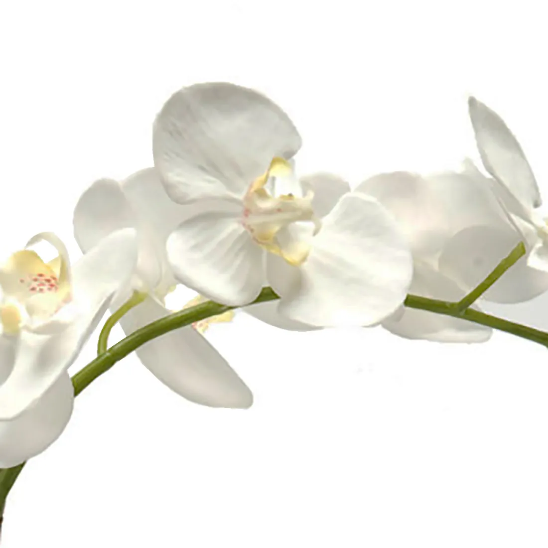 Présentée sous forme de plante, cette fausse orchidée phalaenopsis n'en porte que le nom. Elle est particulièrement réussie et réaliste; que ce soit au niveau du visuel ou que ce soit au niveau du toucher. Les tiges de fleurs artificielles sont assemblées pour reconstituer un plant, les branches fleuries sont donc accompagnées de beau feuillage. L'ensemble est tenu par une imitation de motte de terre. L'ensemble est maintenu par une imitation de motte de terre, recouverte d'un aspect mousse synthétique, avec quelques racines d'orchidée délicatement apparentes. Ce détail confère une authenticité saisissante à cette orchidée artificielle.