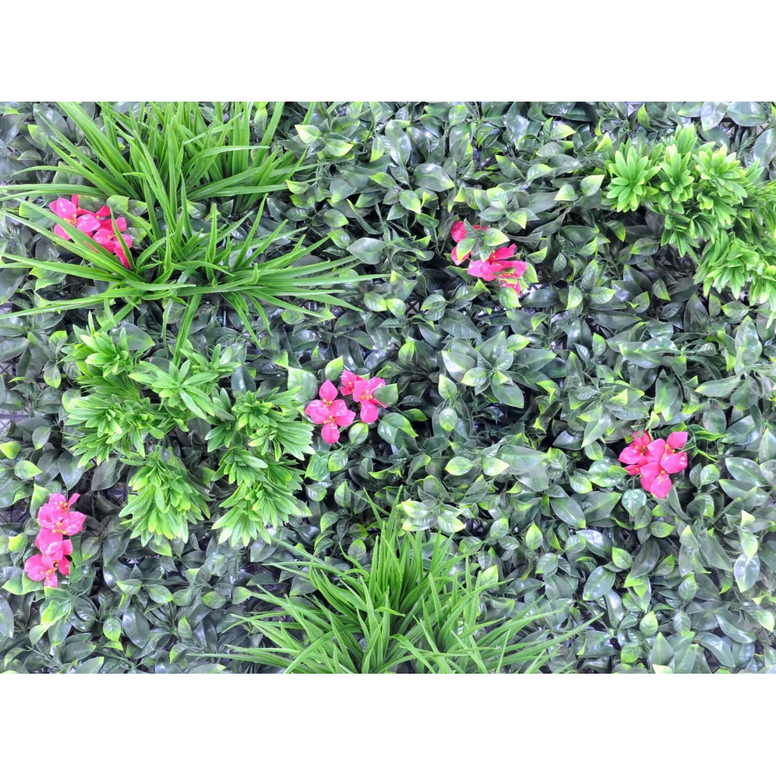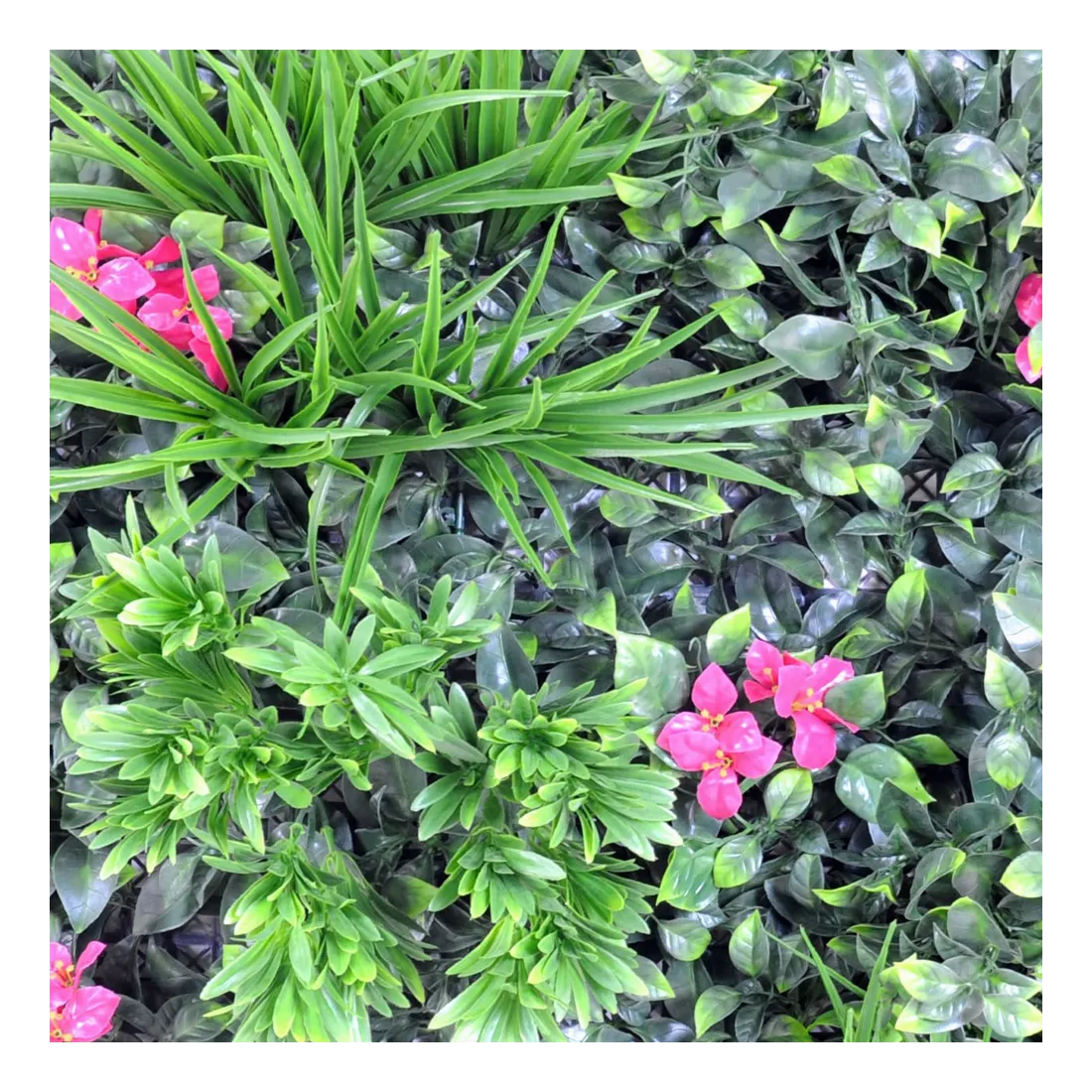 Cette plaque artificielle est facile d'utilisation, facile à installer. le feuillage artificielle est accroché sur une armature en polyéthylène carrée quadrillée, facile pour fixer d'autres plantes.