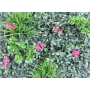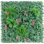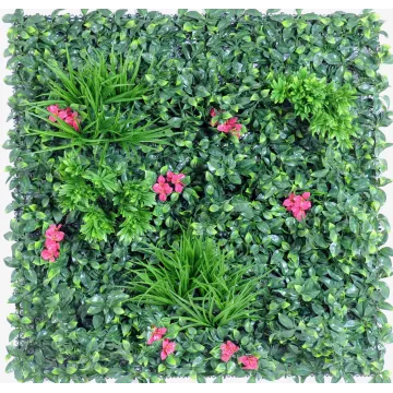 ce mur végétal artificiel est composé de 9 plaques carré souple de 33 cm x 33 cm clipsé, elle mesure 100 cm de cotés par 100 cm de largeur. feuillage artificiel en polyéthylène (plastique) de couleur rose et divers nuances de vert.