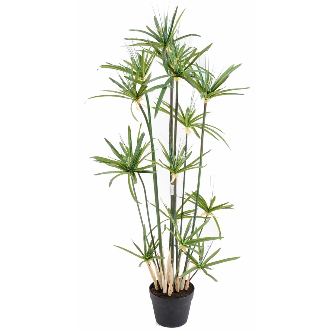 Cette plante de zones humides est appréciée en pot, pour sa forme originale. Elle développe une touffe de tiges portant à leurs extrémités des ""fausses feuilles"" disposées en baleines de parapluie. De fausse plante il n'en a que le nom. Sa tige en polyuréthane (plastique) armé, c'est à dire qu'une aiguille métallique est introduit dans la tige dans toute la longueur afin de pouvoir lui donner la forme désirée. Cette plante artificielle est vendue dans un support plastique (pot PVC noir), la taille indiquée est comprise de la base du pot jusqu'au sommet de la plante.