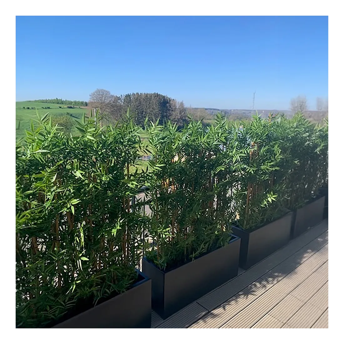 Haie bambou artificiel japenese est composée de 14 à 19 cannes de bambou naturel et d'un feuillage vert en Polyéthylène (plastique). Elle est déclinée en quatre dimensions 90, 110, 150 et 180 cm de hauteur pour 110 cm de longueur et 45 cm de largeur. Livré en un seul morceau, cannes fixées sur socle de 90 cm de longueur par 18 cm de largeur (plantes artificielles )