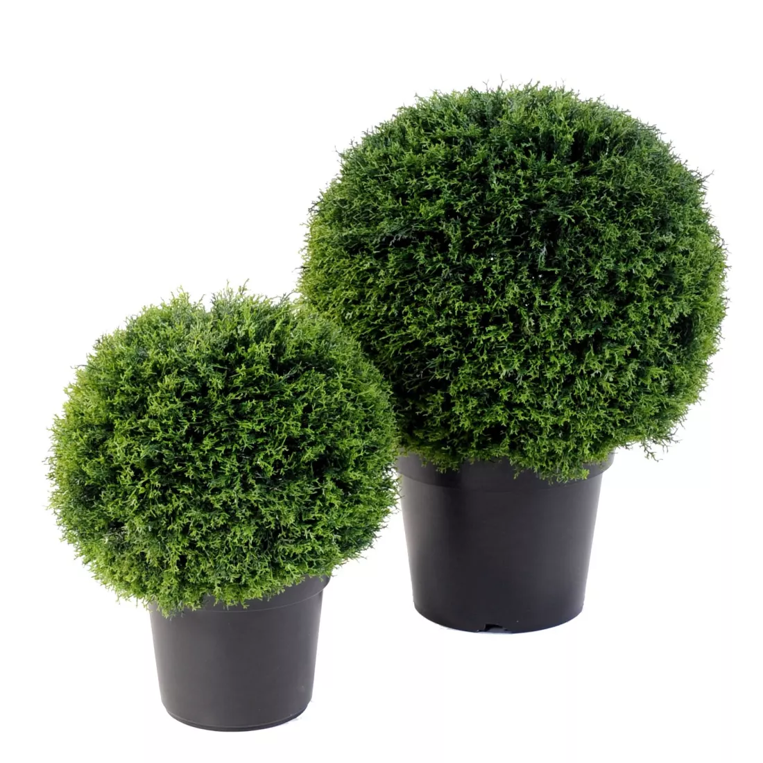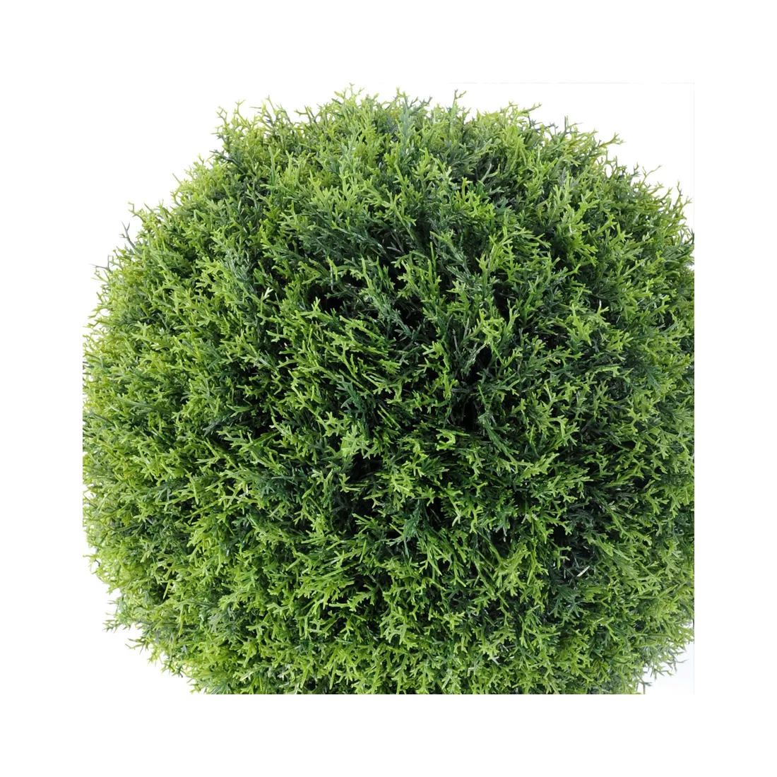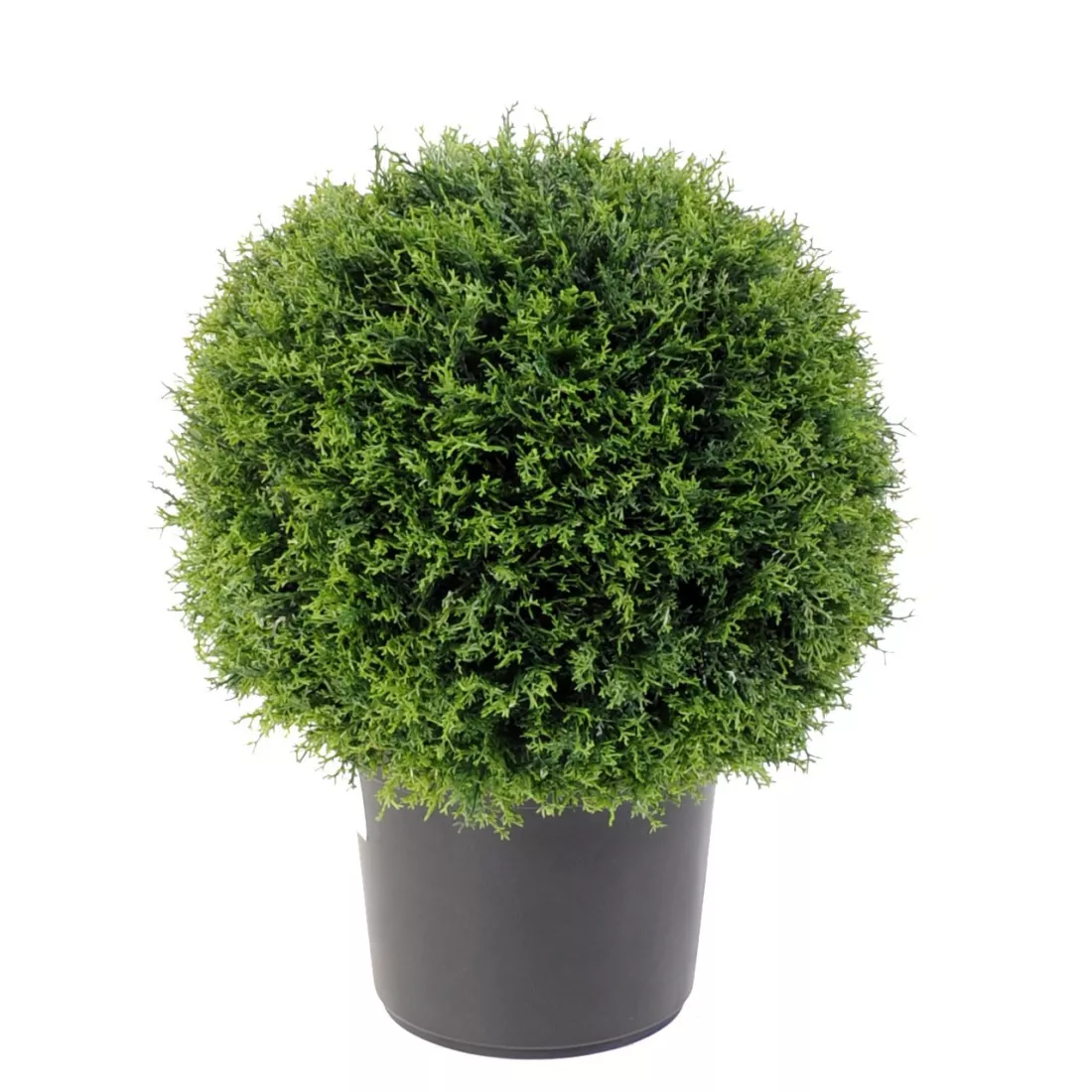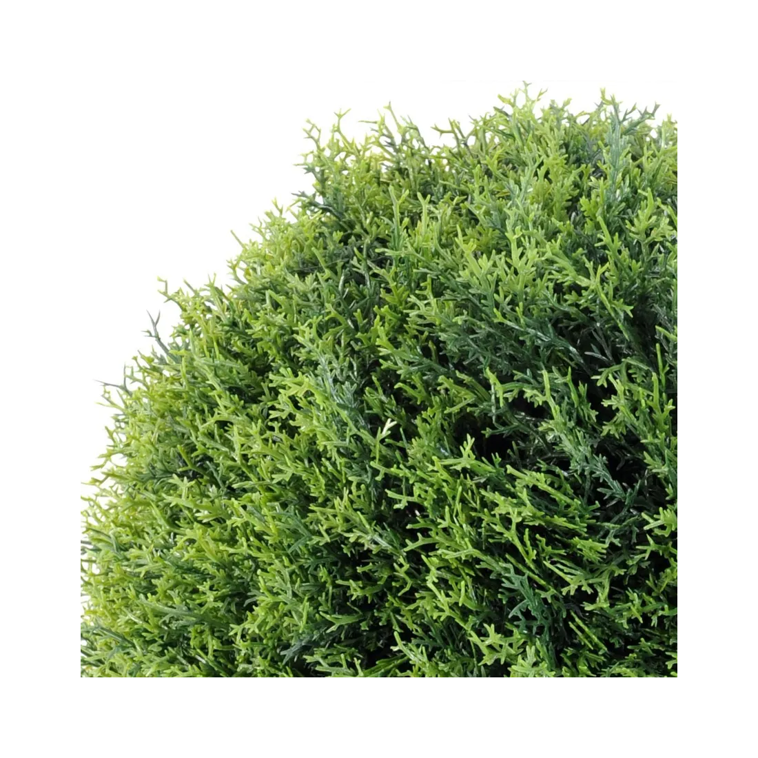 Cyprès artificiel boule décliné en deux dimensions boule de diamètre 33 et 45 cm. Boule accolée au pot, avec une structure plastique sur tronc bois. Produit haut de gamme. Feuillage artificiel en polyéthylène (plastique) Livré dans un pot PVC (support de plantation) plantes artificielles