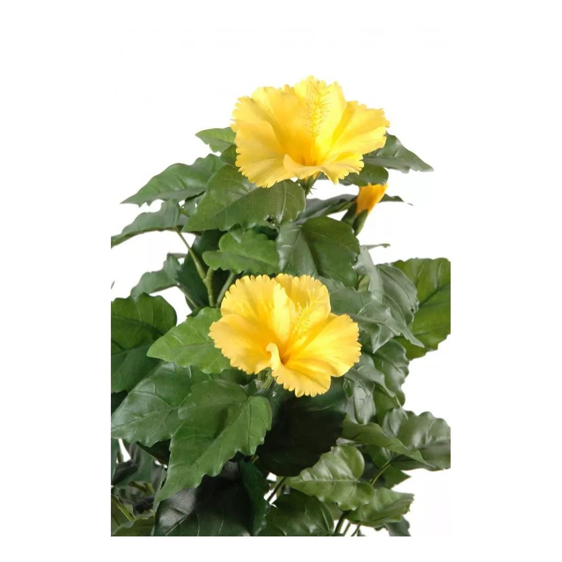 Le faux Hibiscus imite de manière réaliste la plante naturelle, très décorative. Depuis l'antiquité cet arbuste est cultivé pour son caractère ornemental. Les fleurs en tissu, le feuillage synthétique détaillé et le tronc en vrai bois permettent une finition haut de gamme. De la création à la conception cette plante répond à un cahier des charges précis. La taille indiquée est comprise de la base du pot jusqu'au sommet de la fausse plante verte. Pour compléter, ou réaliser des potées fleuries, il existe un joli petit hibiscus artificiel rouge.