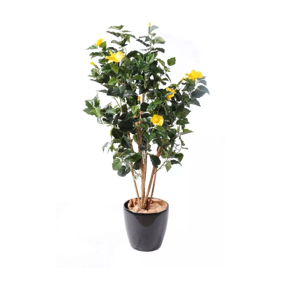 L'Hibiscus artificiel est composé de tronc en bois, de feuilles et de fleurs en tergal (tissu).                                                                  Il est disponible en 110 et 150 cm de hauteur pour une envergure de 60 cm.