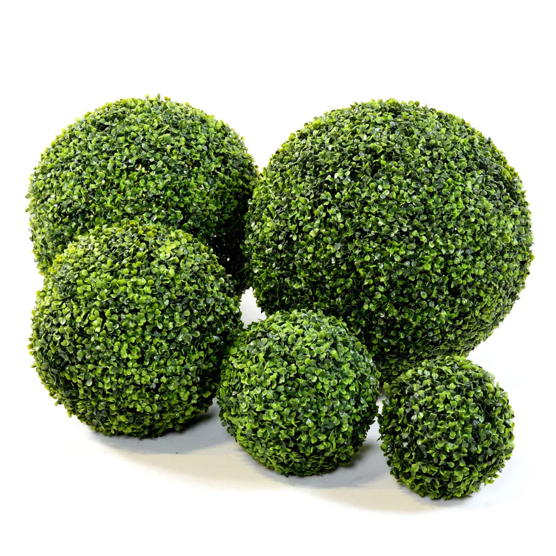 buis artificiel boule ronde proposé en 5 diamètre différents : 22, 25, 35, 48 et 50 cm de diamètre, composé d'un feuillage en polyéthylène et d'une structure en plastique, vendue sans pot ( plante artificielle)