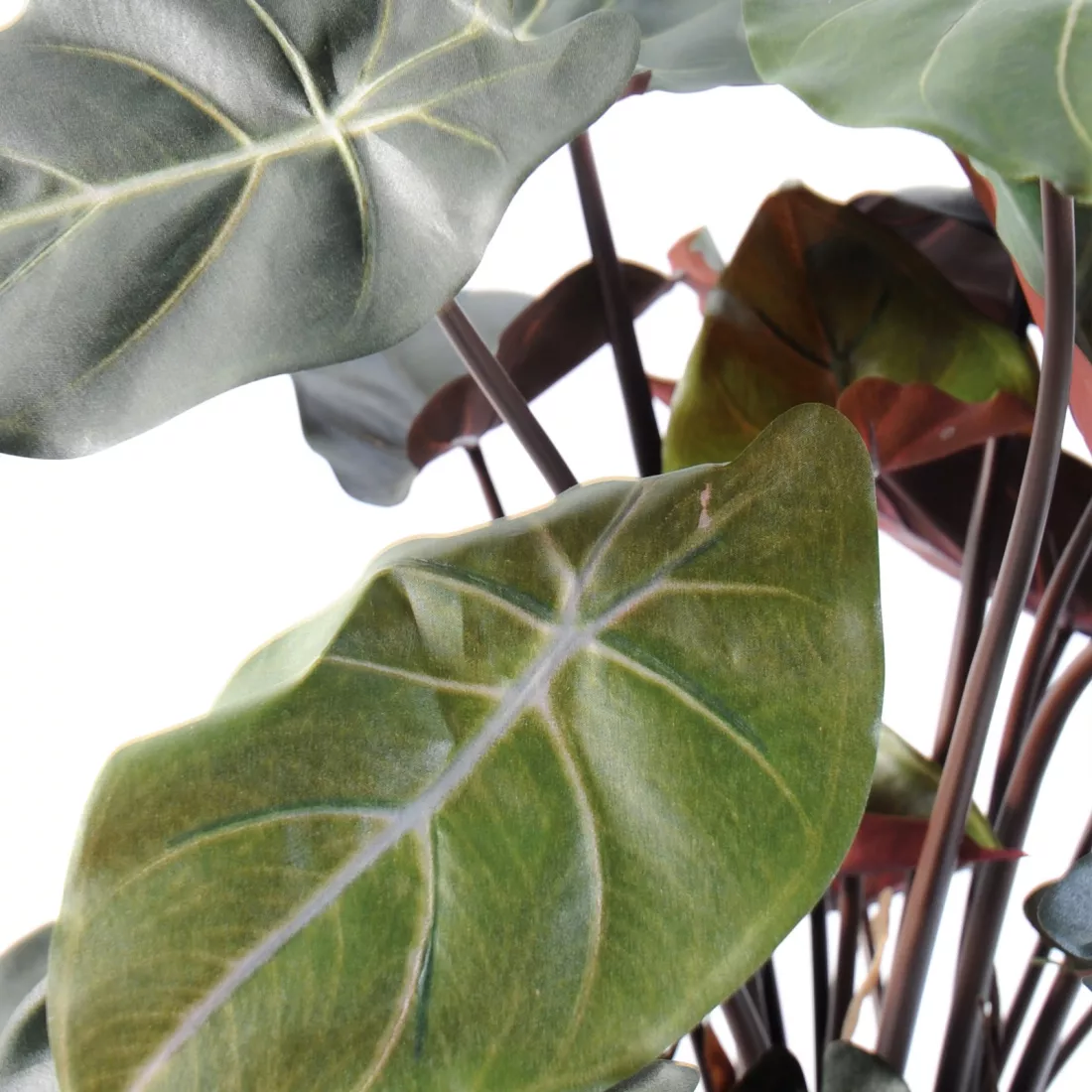 Syngonium podophyllum artificiel mesurant 55 cm de hauteur pour une envergure d’environ 40 cm. Composé de longs pétioles (tiges) souples violacés sur lesquels reposent de grandes feuilles artificielles en tergal (tissu), nervurées et aux bords légèrement ondulés. La face supérieure est vert clair ou sombre, ornée de nervures couleur crème, tandis que la face inférieure est d’un beau violet pourpré. Cette plante tropicale artificielle élégante est livrée dans un support en plastique. La taille indiquée est comprise de la base du pot jusqu'au sommet des feuilles.