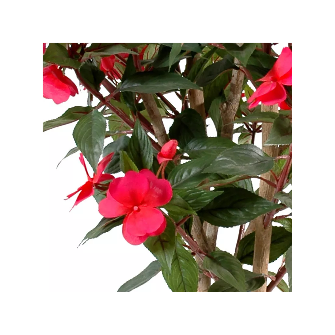 Impatiens artificielle arbuste au feuillage légèrement panaché et aux fleurs délicates.