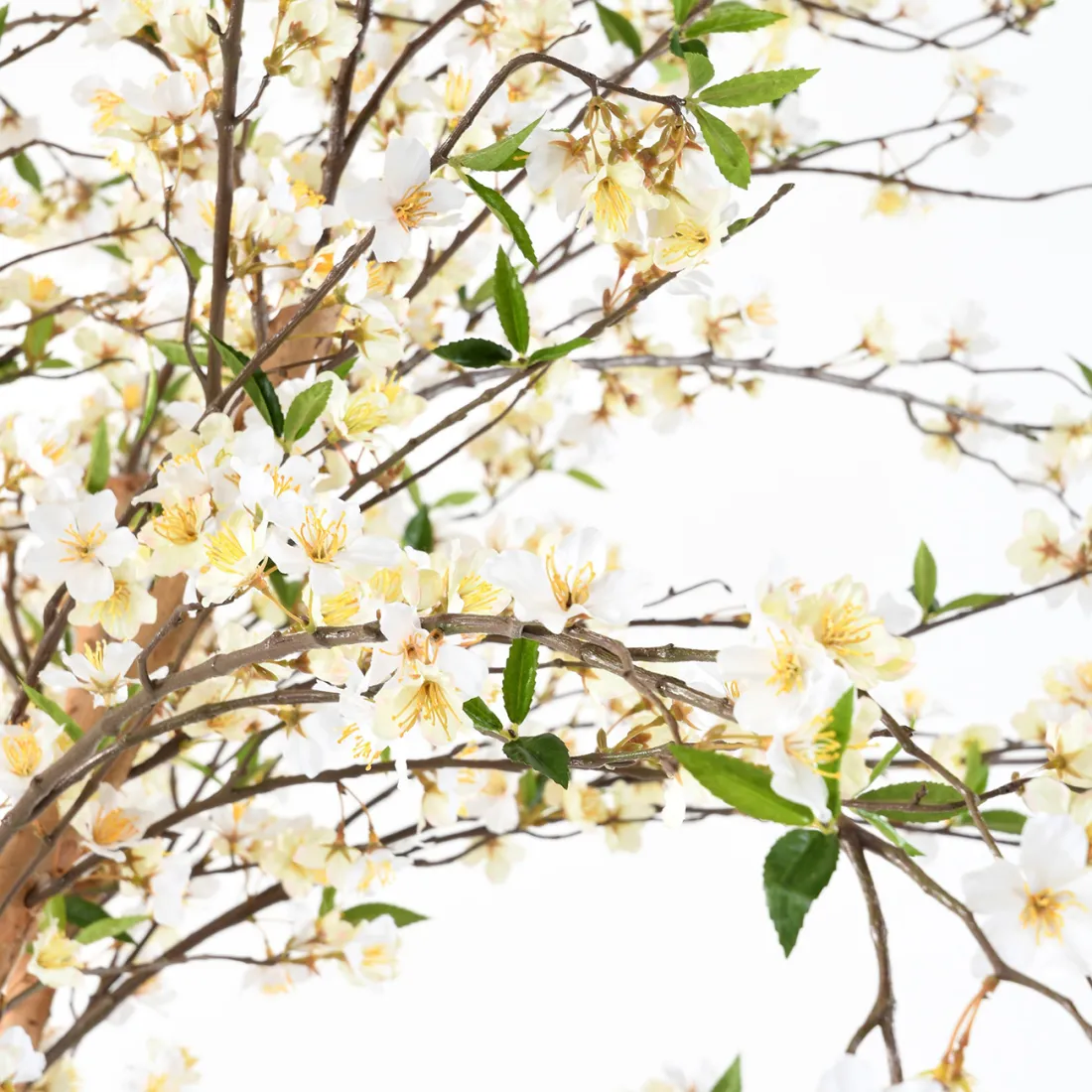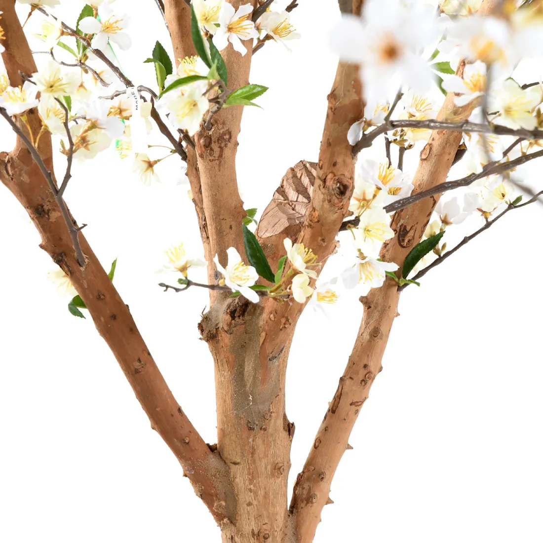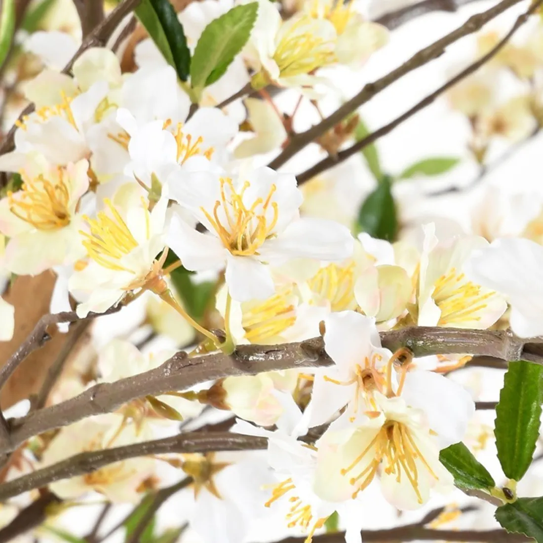 Ce cerisier artificiel dispose d'un tronc travaillé, d'une hauteur de 220 cm et d'une belle envergure de 150 cm. Pour plus de réalisme son faux tronc est réalisé en bois naturel. c'est un arbre haut de gamme qui ravit les personnes les plus exigeantes. Son feuillage artificiel est en polyester, tissu, et dispose de magnifiques fleurs blanche répartie sur l'ensemble de l'arbre et quelques jeunes pousse de feuillage artificiel.  Cette plante artificielle est livrée en plusieurs morceaux, 3 branches en bois déjà feuillues sont à insérer dans les trous prévus à cet effet. Tout est numéroté pour les correspondances, l’assemblage très facile à faire. Les vis de maintien sont fournies ainsi que de la pâte à bois destinée à dissimuler les jointures branches/tronc.Cette plante artificielle magnifique et haut de gamme est vendue dans un pot en plastique lesté afin de facilité son calage dans un autre pot.