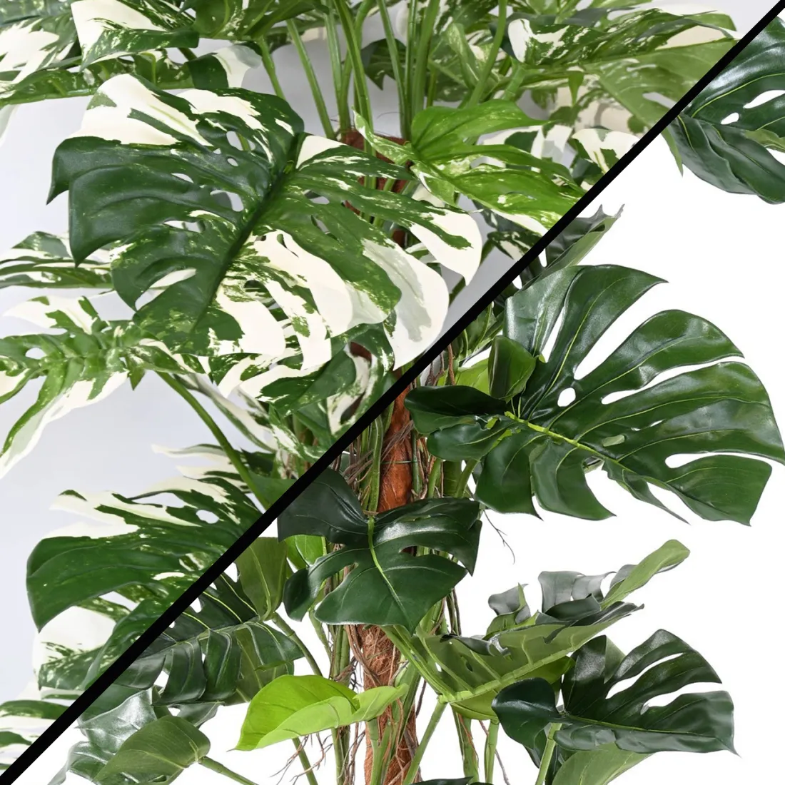 Ce « faux philodendron » Monstera Deliciosa surnommé « plante gruyère » en raison des perforations de ses feuilles, est une plante grimpante appartenant à la famille des Aracées qui nous vient des forêts tropicales humides d’Amérique Latine. Pour un visuel plus vrai que nature, cette magnifique fausse plante tropicale aux finitions impeccables se hisse le long d’un tronc en bois à l’aide de ses petites lianes marrons afin de présenter son abondant feuillage ornemental constitué de feuilles artificielles élégamment ondulées et découpées, aux dimensions variables et aux nervures saillantes. En somme, vous avez tous les côtés positifs du Monstera sans aucune des contraintes traditionnellement liées à ce type de plante tropicale.