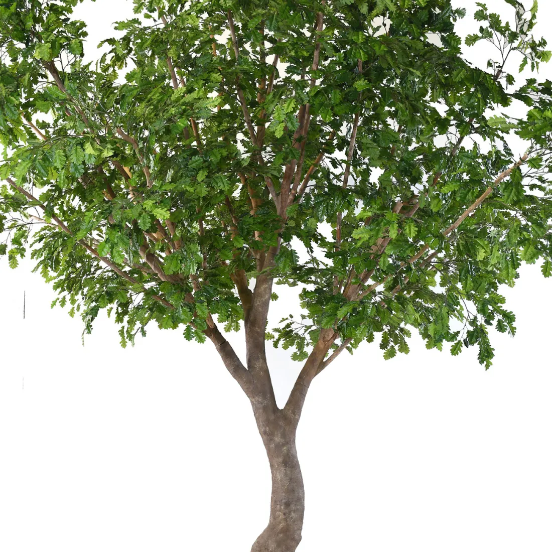 Chêne artificiel S, arbre continental artificiel proposé en 360 et 420 cm de hauteur pour une envergure de 290 et 310 cm, tronc en fibre de verre et bois et feuillages en tissu (tergal). Livré dans un bac en bois (support de plantation) plantes artificielles