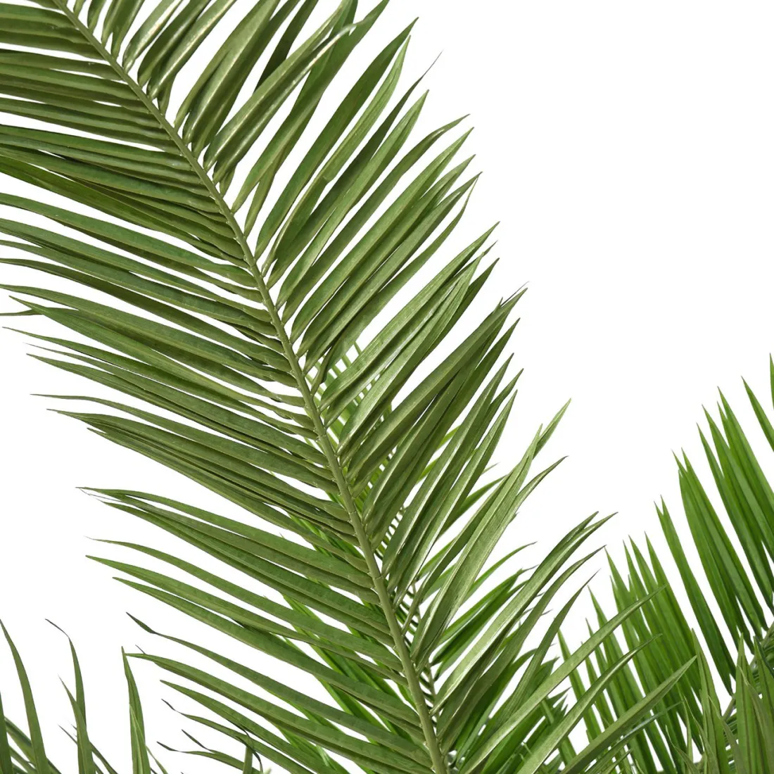 Ce faux palmier est un sujet ornemental exceptionnel, très graphique, il est composé d'un tronc présentant les parties foliaires anciennes et sa splendide couronne de 350 cm de largeur ou d'envergure. En voilà un qui se différencie vraiment de ses semblables. Même si vous n'avez pas la main verte, cette plante sera la pièce maîtresse de votre décoration tropicale. Du haut de gamme moderne et original.