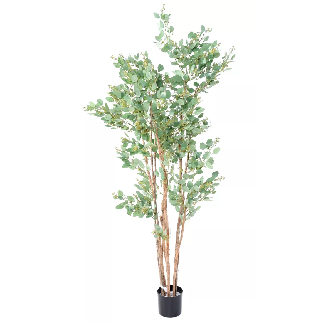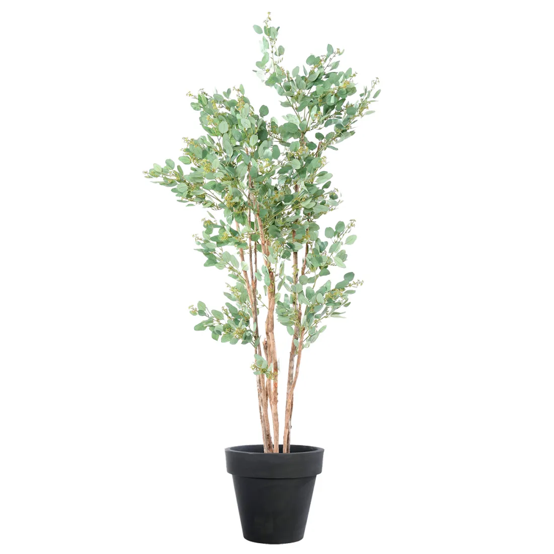 Eucalyptus artificiel buisson est composé de 6 troncs en bois naturel,d'un feuillage vert en polyester, tissu et de baies en polyéthylène, plastique. Proposé en 180 cm pour une envergure de 70 cm. Livré dans un pot plastique bétonné, support de plantation ( plantes artificielles )