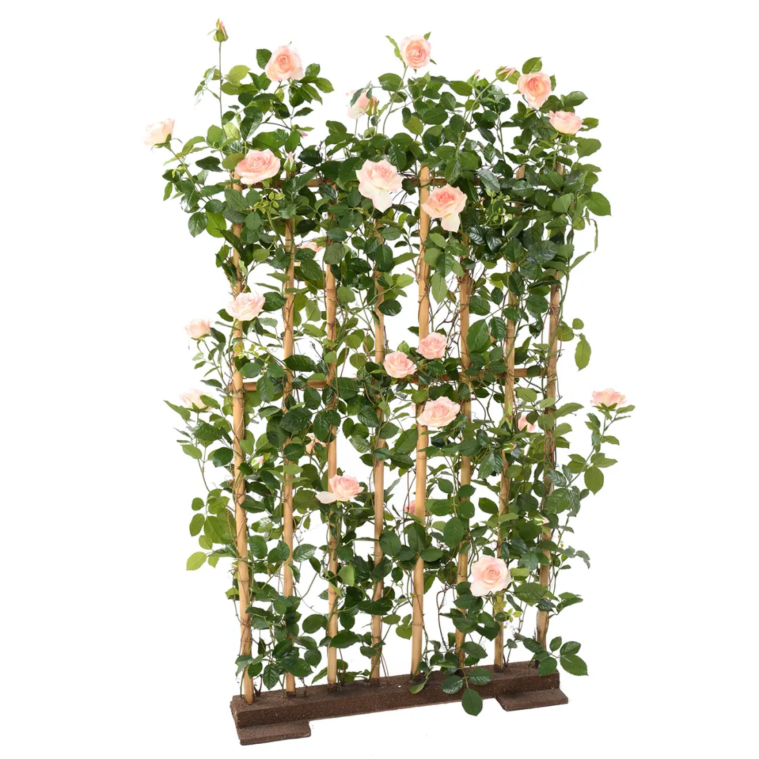 Tout comme un rosier grimpant, cette palissade surprend par son réalisme, le support une structure de 8 cannes de bambou fixé dans un socle en bois de 75 cm de longueur, les roses artificielles de couleur rose clair ont grimpés, ou tout comme, le long de ces différents tuteur. Cette fausse haie de rosier est un produit de qualité, haut de gamme.