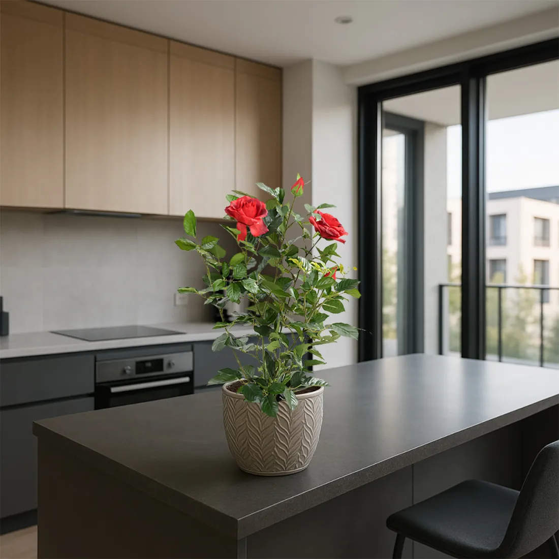 Ce rosier artificiel royal est composé d'un feuillage et de fleurs en tissu: Tergal. Décliné dans 5 couleurs, il mesure 60 cm de hauteur pour une envergure de 35 cm Livré dans un pot plastique lesté, servant de support de plantation ( plantes artificielles )