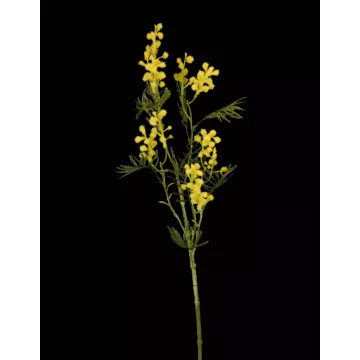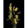 Belle branche de mimosa artificielle jaune. Le volume de cette tige est intéressant. Elle est divisée en 3 sections sur lesquelles sont disposées trois grappes de fleurs pompon. Le feuillage est bien découpé. Fleur de fin d'hiver ou de début de printemps, le mimosa est réputé pour ses floraisons spectaculaires, mais courtes. Dans les bouquets, le faux mimosa vous permet d'insérer dans vos bouquets, des fleurons peu ordinaires en forme de petites sphères duveteuses. Le jaune mimosa illumine les compositions et les pièces, il apporte le soleil dans les intérieurs. Et cela à n'importe quelle saison. Mélanger avec des bouquets secs. Mais aussi associer avec des tulipes artificielles, des roses, des oeillets artificiels, ou des herbes indisciplinées. Pour un aspect plus que naturel, créer une botte de mimosa en fleur!