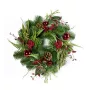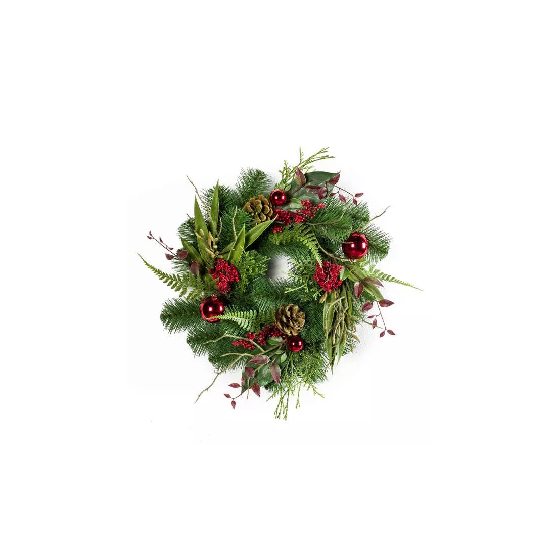 Cette couronne festive est créée sur la base de branches de sapin artificiel à épines non piquantes. Elle est aussi agrémentée de faux cyprès vert, de petites baies rouge, de feuilles de bambou factices, de petits feuillages décoratifs et de boules de Nöel rouge brillant pour rendre l'ensemble éclatant. Traditionnelle cette couronne est une valeur sure indémodable. Peut s'accorder avec la guirlande de faux sapin.