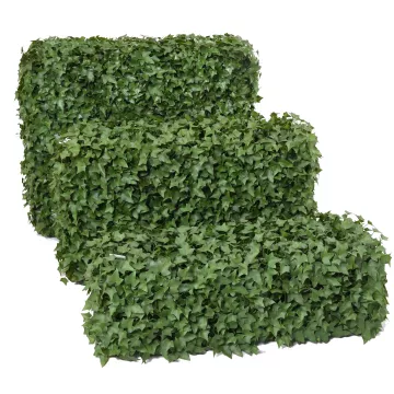La haie est proposée en 3 hauteurs différentes. Elle est conçue comme un petit muret recouvert de feuillage sur 5 façes. Seul le dessous est vide. Les feuilles de lierre sont fixées sur une structure métallique grillagée rigide et creuse dedans. L'occultant artificiel est complètement opaque. Il se pose ou s'insère dans une jardinière. Il convient aussi bien en extérieur qu'en intérieur. Le mur de faux lierre peut servir de brise vue sur une terrasse ou un balcon. Il est également esthétique pour séparer des espaces. Vous pourrez le glisser dans un contenant bas ou haut, cela dépendra de la nécessité et du résultat que vous souhaitez.