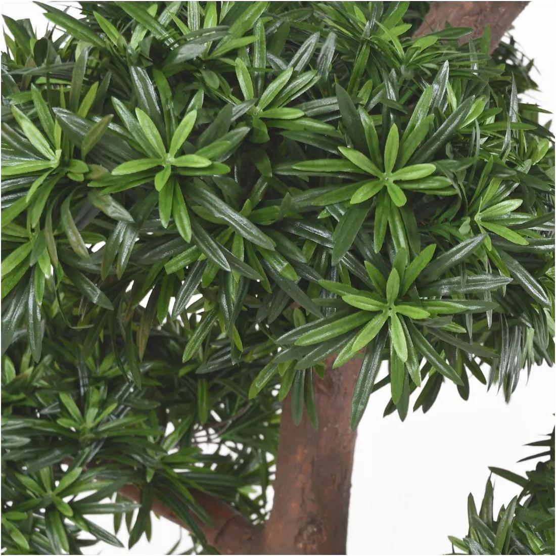 Les troncs sont très souvent synthétiques, crées en résine polyester ou mousse polyuréthane. L'idée est d'imiter les formes et imperfections naturelles des bois véritables et de faire des articles semblables qui respectent les photos de présentation. Ils sont teintés de manière manuelle. Quelques uns sont en vrais bois et tout aussi réussis. Les feuillages des conifères sont fabriqués en pvc par soucis du détail des aiguilles. Les autres feuilles synthétiques sont en tergal tissu, véridiques également. La mise en forme de la verdure, très facile, vous incombe à la réception.