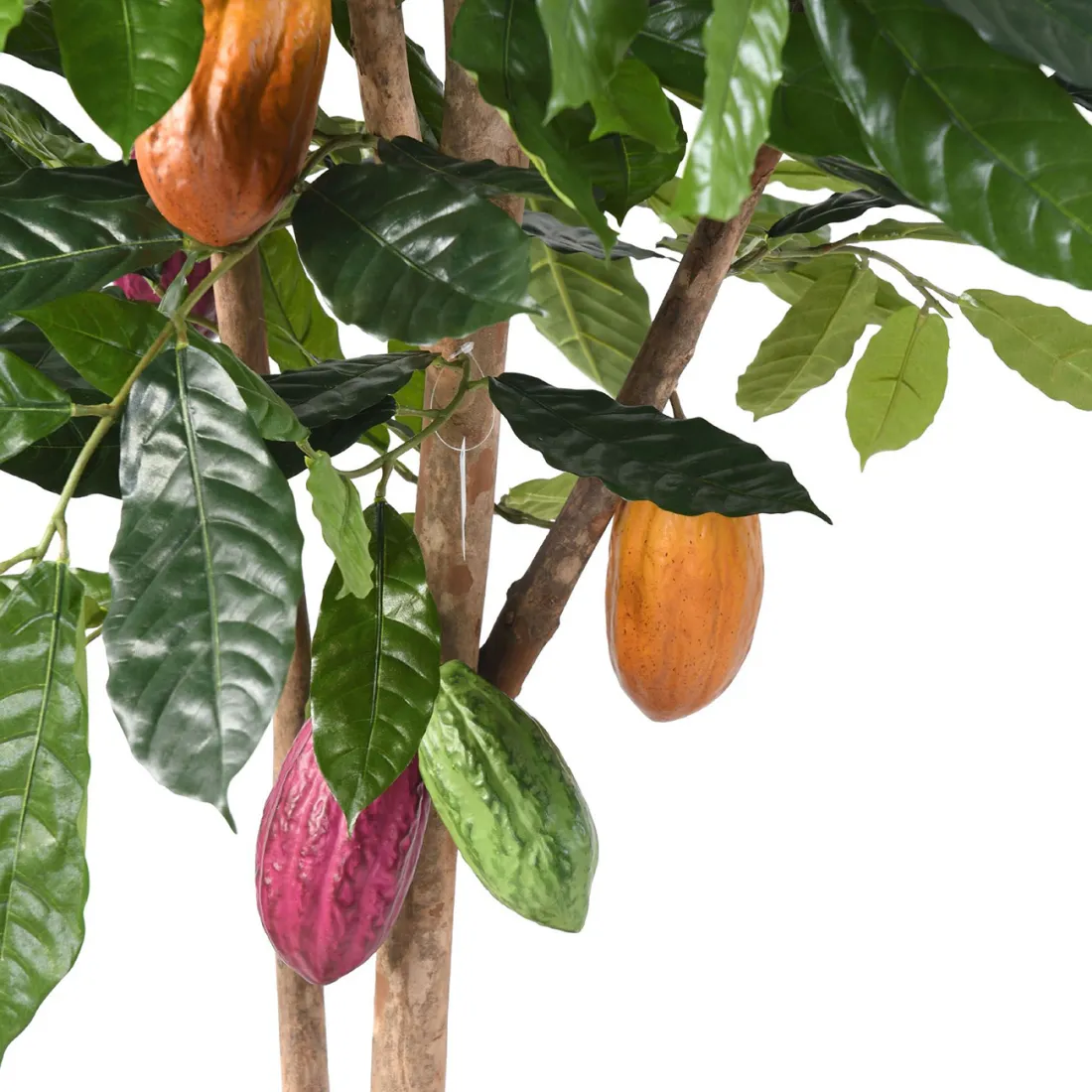 CACAOYER artificiel mesure 210 cm de hauteur pour une envergure de 120 cm , Double tronc en bois naturel, Hauteur sous feuillage: 80 cm, feuilles artificielles en tissu (tergal), 7 cabosses (fruit contenant les fêves de cacao) réparties sur cet arbre artificiel de différentes couleurs jaune, vert et violet. livré dans un pot PVC (support de plantation) plante artificielle