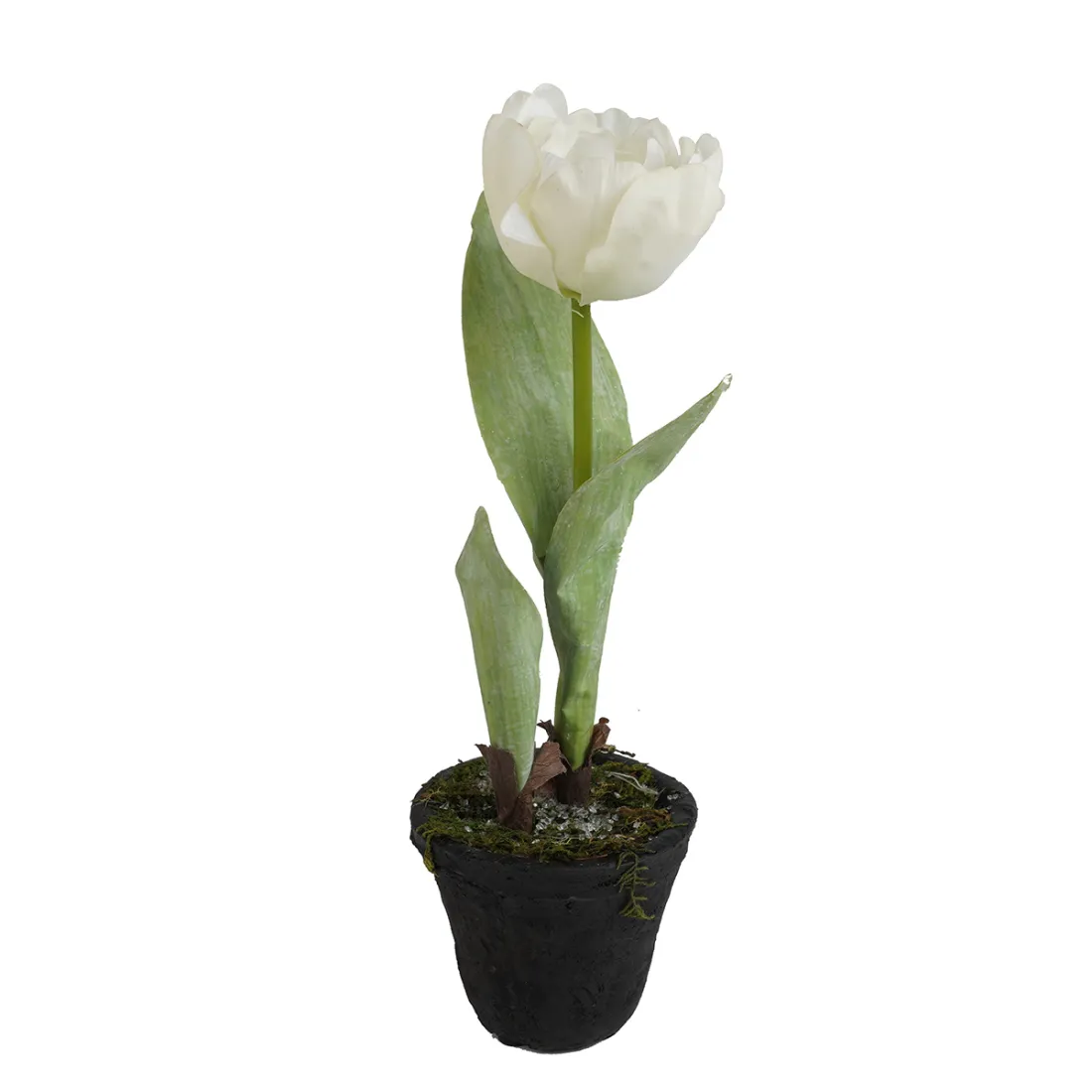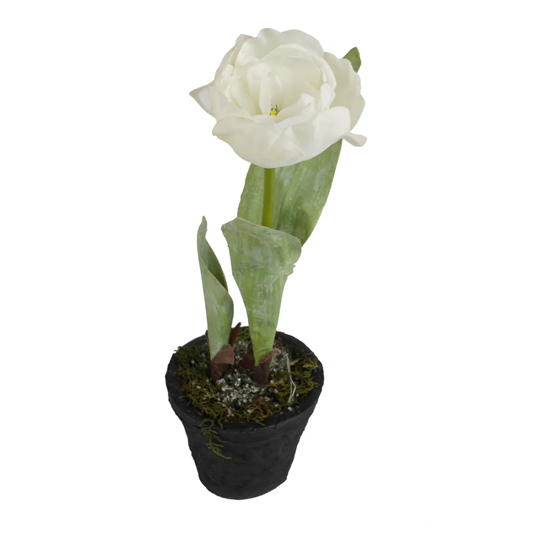 Cette tulipe artificielle présenté dans un pot en terre cuite noire, hauteur 7 cm, imitant une motte de terre. Mesurant 26 cm de hauteur totale et 11 cm d'envergure, cette fausse fleur présente un diamètre de 7 cm.