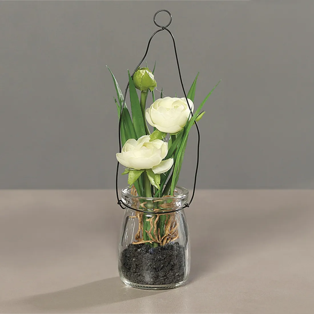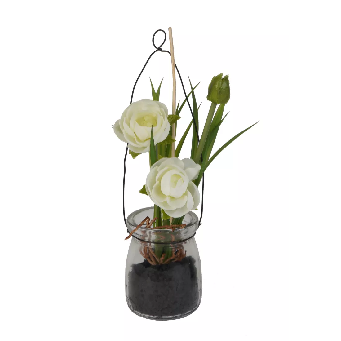 RENONCULE artificielle en pot verre à poser ou à suspendre 23 cm