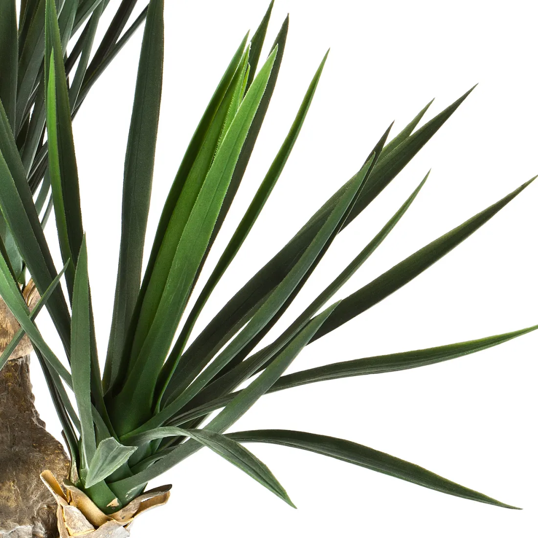 Le yucca est une plante du désert, appartenant à la famille des Agavacées, appréciant les régions chaudes et l'air sec. Ici pas de souci d'humidité, cette fausse plante n'est pas prête de faner... Le yucca est doté de longues feuilles artificielles pointues en rosettes relativement rigide, en forme d'épée, implanté sur le tronc. Son réalisme est impressionnante, Ce yucca fait partie des yucca rostrata ou yucca rostré. Sa réalisation a subit un cahier des charge précis afin de garantir un produit haut de gamme. Cette plante possède un tronc non lisse de 8 cm de diamètre et trois touffes de feuillage artificielle à emboîter. Cette fausse plante est vendue dans un support plastique (pot PVC noir), la taille indiquée est comprise de la base du pot jusqu'au sommet de la plante.