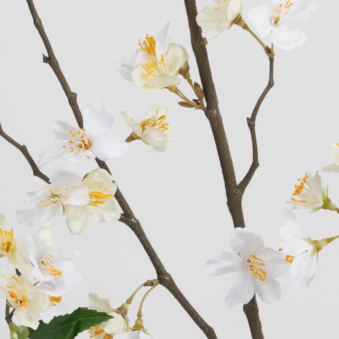Branche de cerisier artificielle d'une hauteur de 115 cm, dont 40 cm correspondent à la tige. La hampe florale mesure 70 cm de long et s'étend sur une largeur de 30 cm. Les fleurs, fabriquées en tissu polyester, sont proposées en trois coloris variés agrémentés de pistils jaunes orangés: blanc, rose clair, et un mélange de crème et rose. La tige est renforcée, ce qui vous permet de lui donner la forme désirée grâce à un fil de fer intégré. Cette branche présente plusieurs ramifications et compte environ 70 fleurs. De plus, la tige peut être raccourcie facilement à l'aide d'une pince coupante.