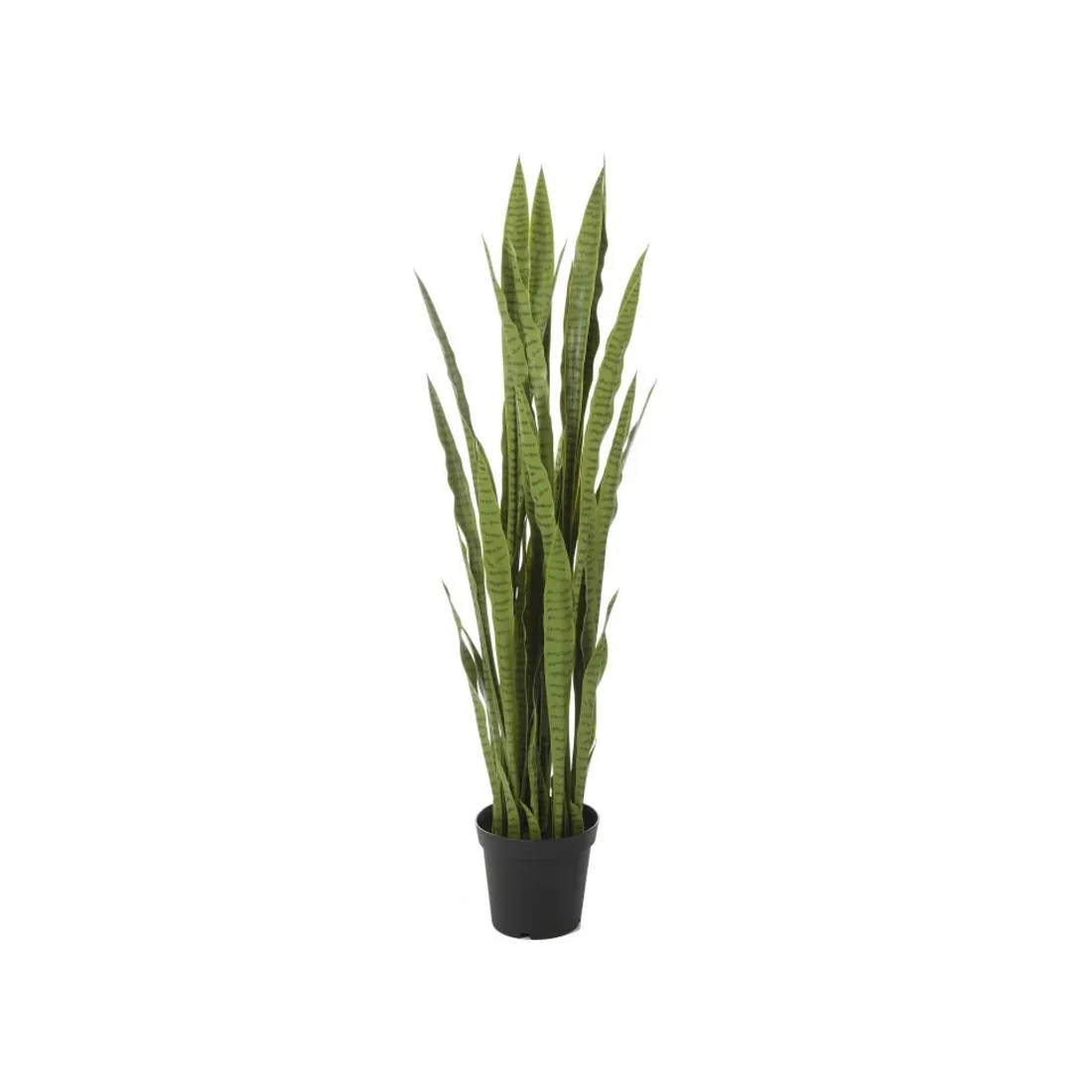 Le sansevieria originaire des régions subtropicales, familièrement appelée Langue de belle mère ou plante serpent. Cette sansevière artificielle est une copie parfaite du sansevieria trifacciata. Elle est composée de 30 feuilles en polyéthylène, matière plastique, mesurant 5 cm au plus large, 9 piquets de feuilles, 2 au centre et 7 autour. La taille est de 110 cm pour 50 cm d'envergure. Ses feuilles rigides verticales sont soit vertes avec des bandes transversales de couleur vert foncé, ou vertes avec une bordure jaune.Cette Sansevieria artificielle superbe réalisation. Livré dans un pot pvc lesté servant de calage dans un cache pot. la taille indiquée est comprise de la base du pot jusqu'au sommet de la plante.