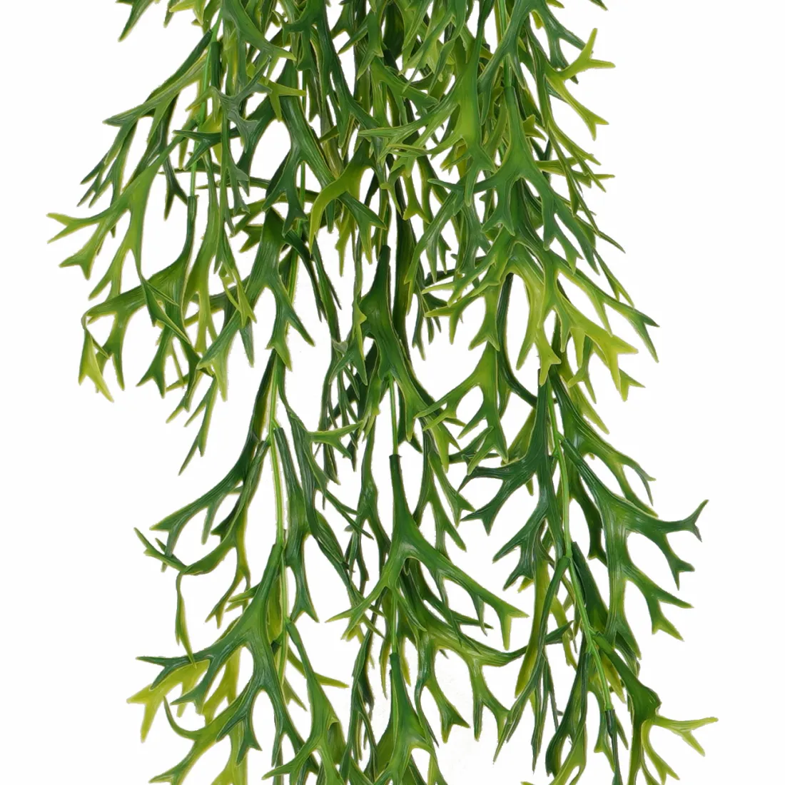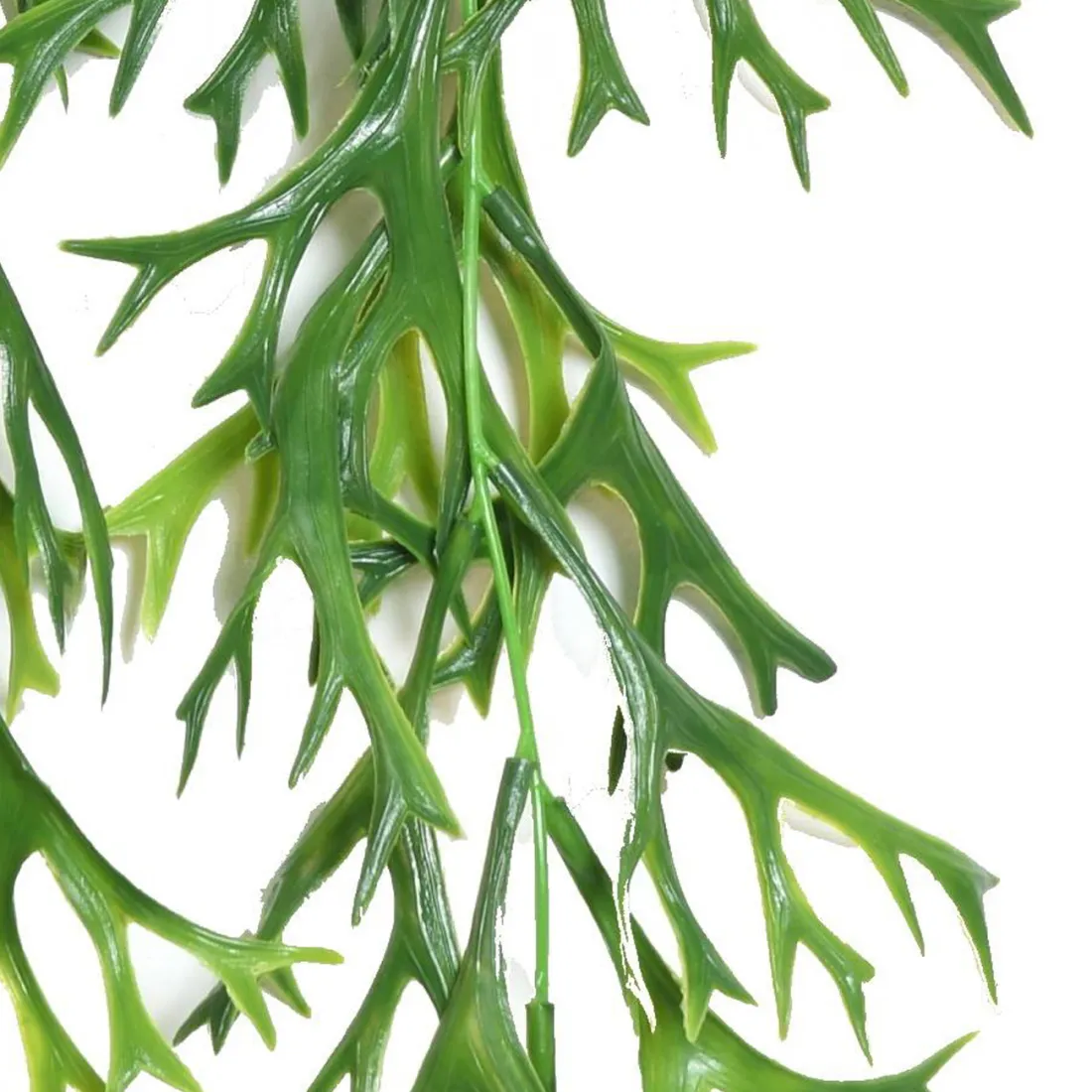 Originaire des régions tropicales, le Platycerium est un genre de fougère épiphyte de la famille des Polypodiacées souvent surnommé « cornes de cerfs » en raison de la forme de leurs feuilles. Son feuillage artificiel atypique en polyéthylène vert que vous pourrez façonner grâce à ses branches souples, vous permettra d'utiliser cette plante artificielle bon marché en extérieur, sans craindre de la voir se dégrader rapidement. Cette cascade synthétique ne nécessite aucun entretien (ni taille ni élagage), un simple nettoyage à l’eau savonneuse est suffisant. Vous pouvez la placer dehors ou dans votre maison, une décoration surprenante.