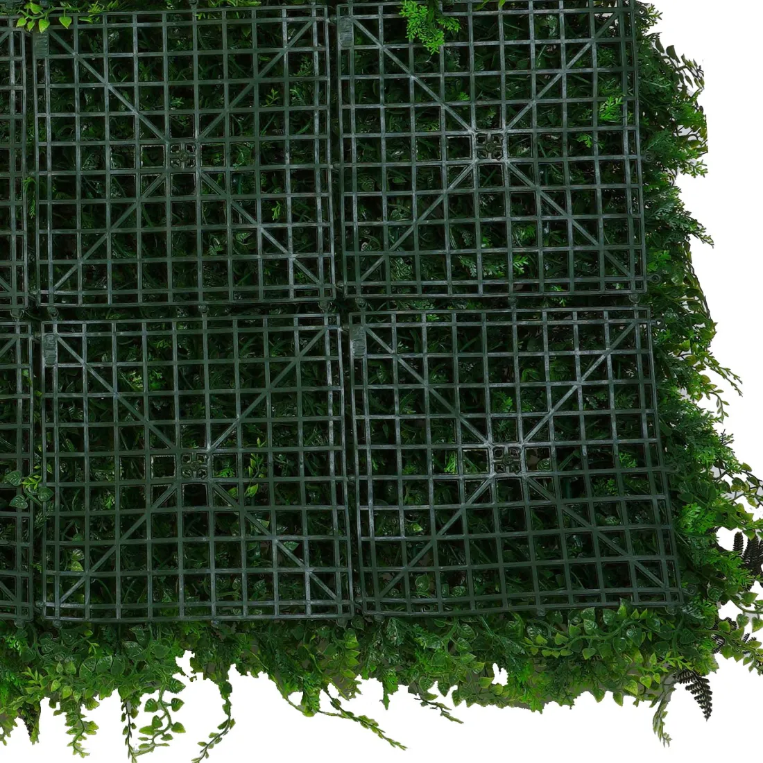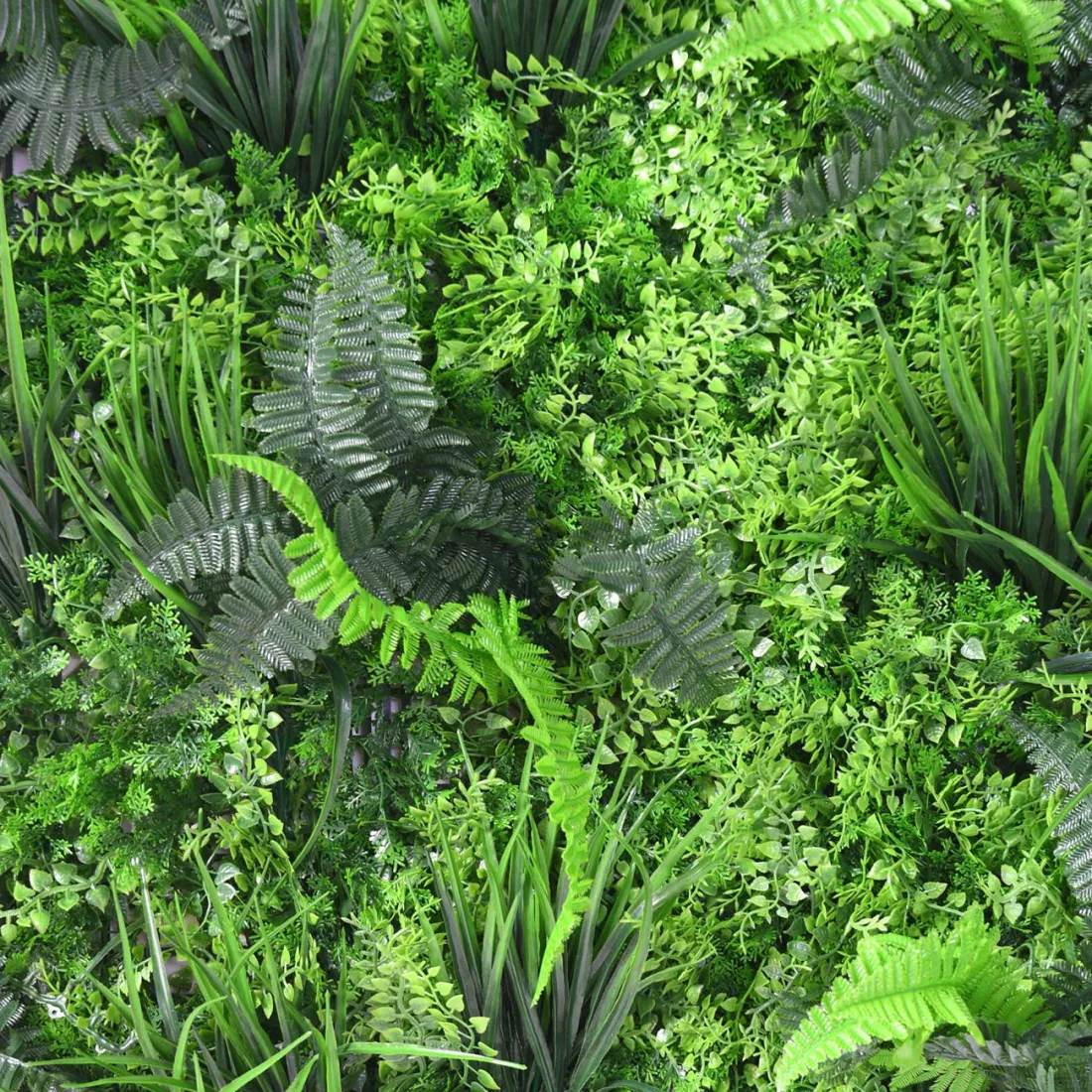 Ce mur végétal artificiel est composé de 16 plaques carrées souples de 25 cm x 25 cm clipsées entre elles. L'ensemble de ce faux mur mesure 110 cm de cotés par 110 cm de largeur. Le panachage de vert clair et vert foncé ajoute à la véracité du mélange de plantes synthétiques.